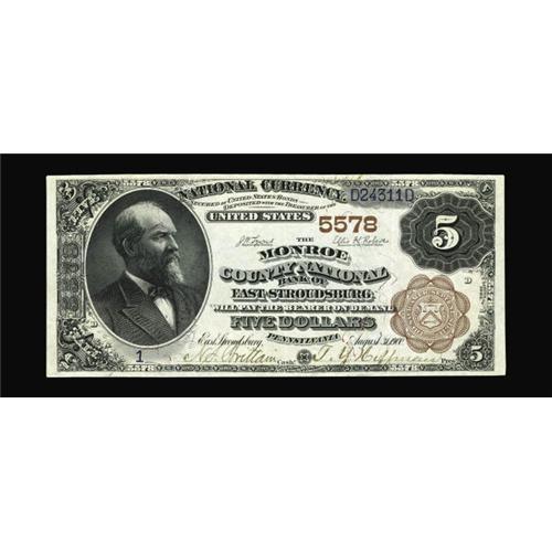 <B>East Stroudsburg, PA</B></I> - $5 1882 Brown Back Fr. 477 <B>The Monroe County NB</B></I> Ch. # 5578<BR>A lovely serial number 1 Brown Back which is the only serial number 1 example of any type or denomination known from here. Well centered pen signed <B>Extremely Fine-About Uncirculated,</B></I> a real prize for the collector.