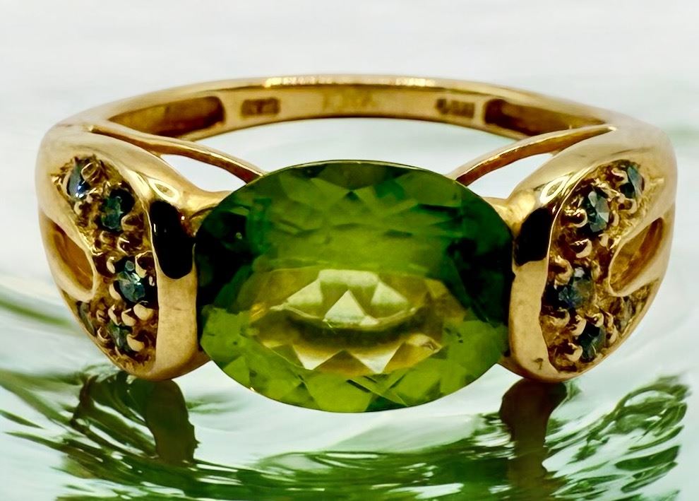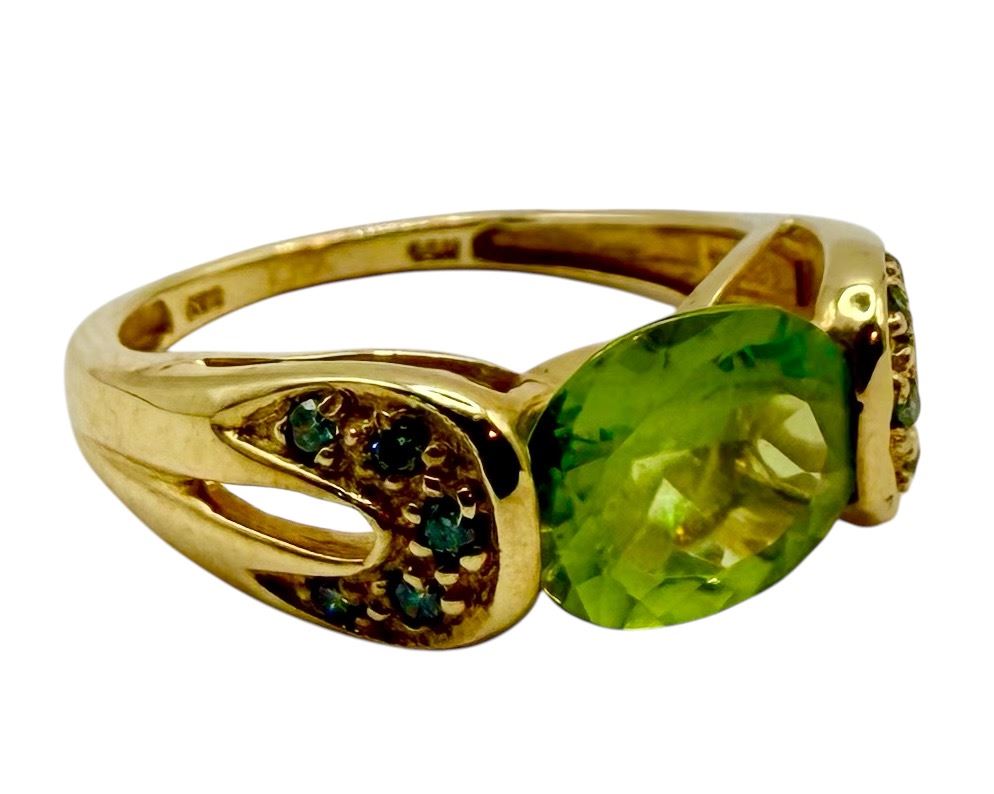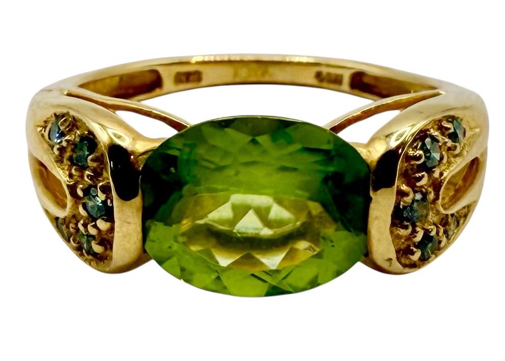 This is a 14 karat yellow gold ring with an approximate 2.50 carat oval-cut, East-West set, genuine peridot with approximately .10 carats total weight round, brilliant-cut, blue diamonds (approximate SI2) in the cathedral shoulders.& nbsp; The ring is approximately size 7 and can be sized for an additional charge. Please contact Bidfair Fine Jewelry for sizing details. This is a brand new item that has been held in back stock. It is in excellent condition, but may have minor signs of storage, such as fine scratches or patina.& nbsp; Admin: 33110/5wid