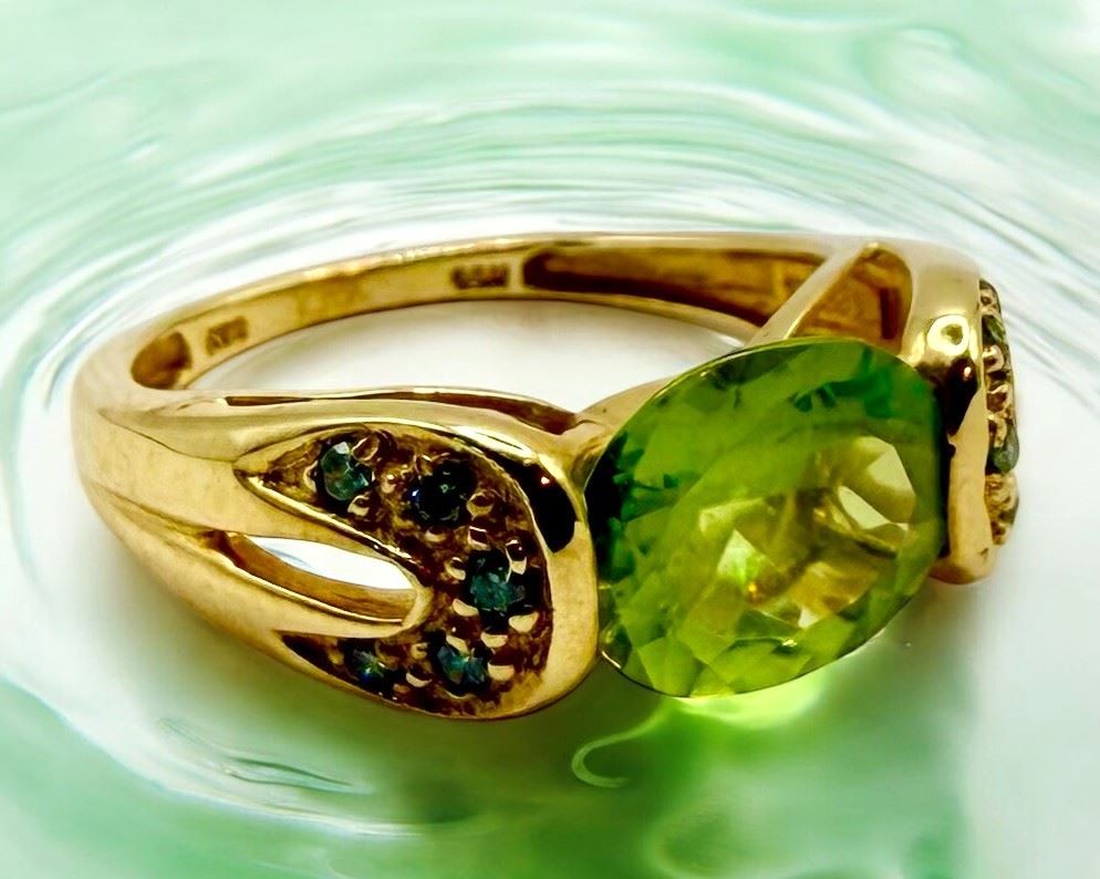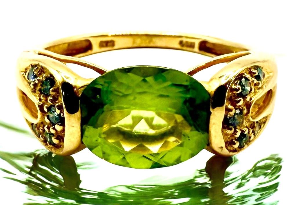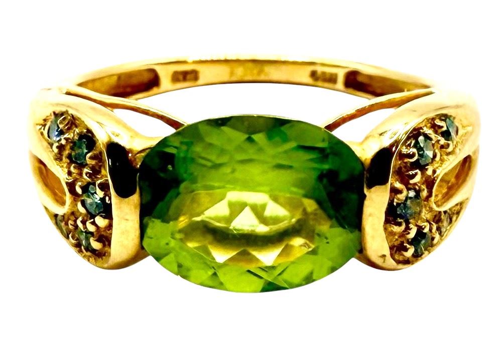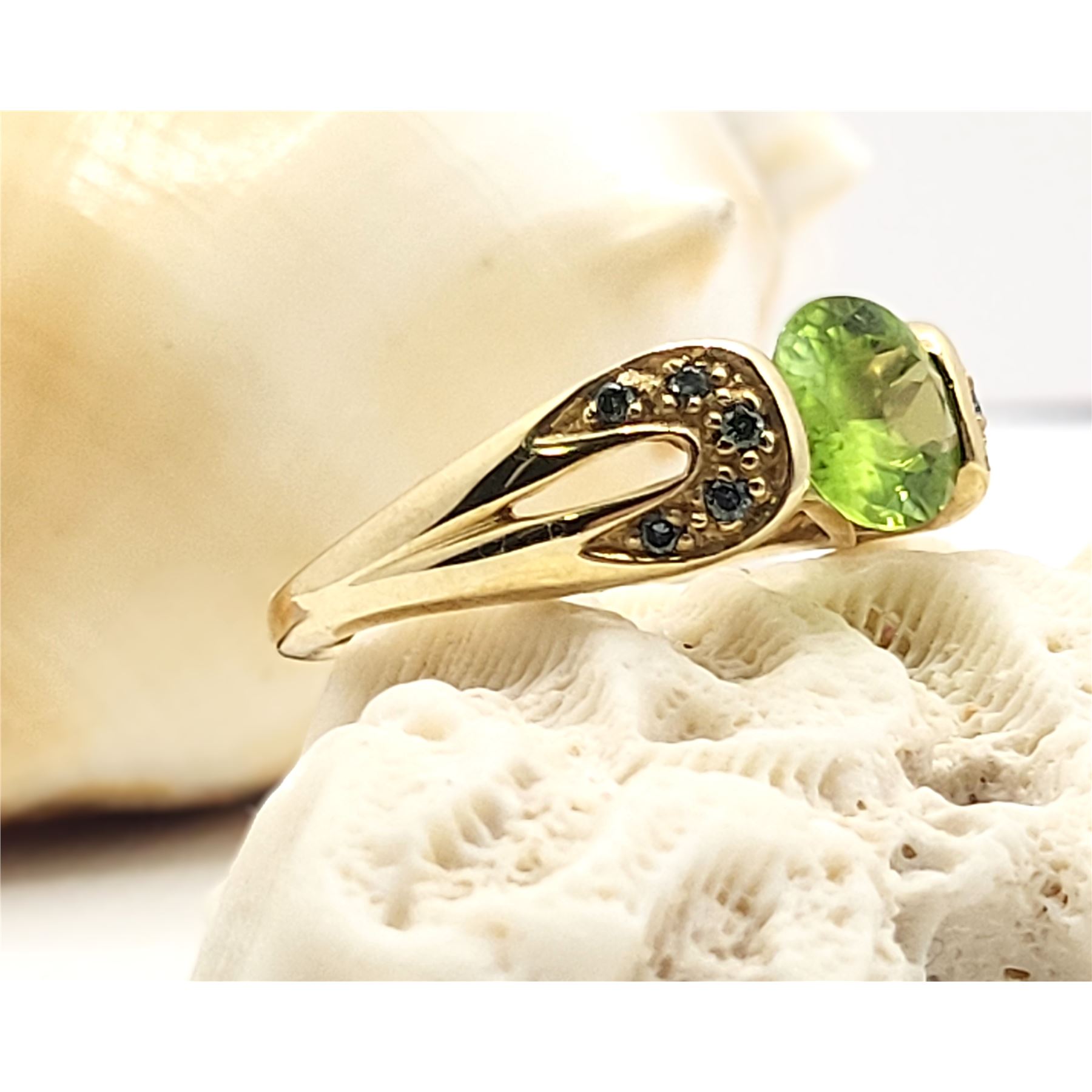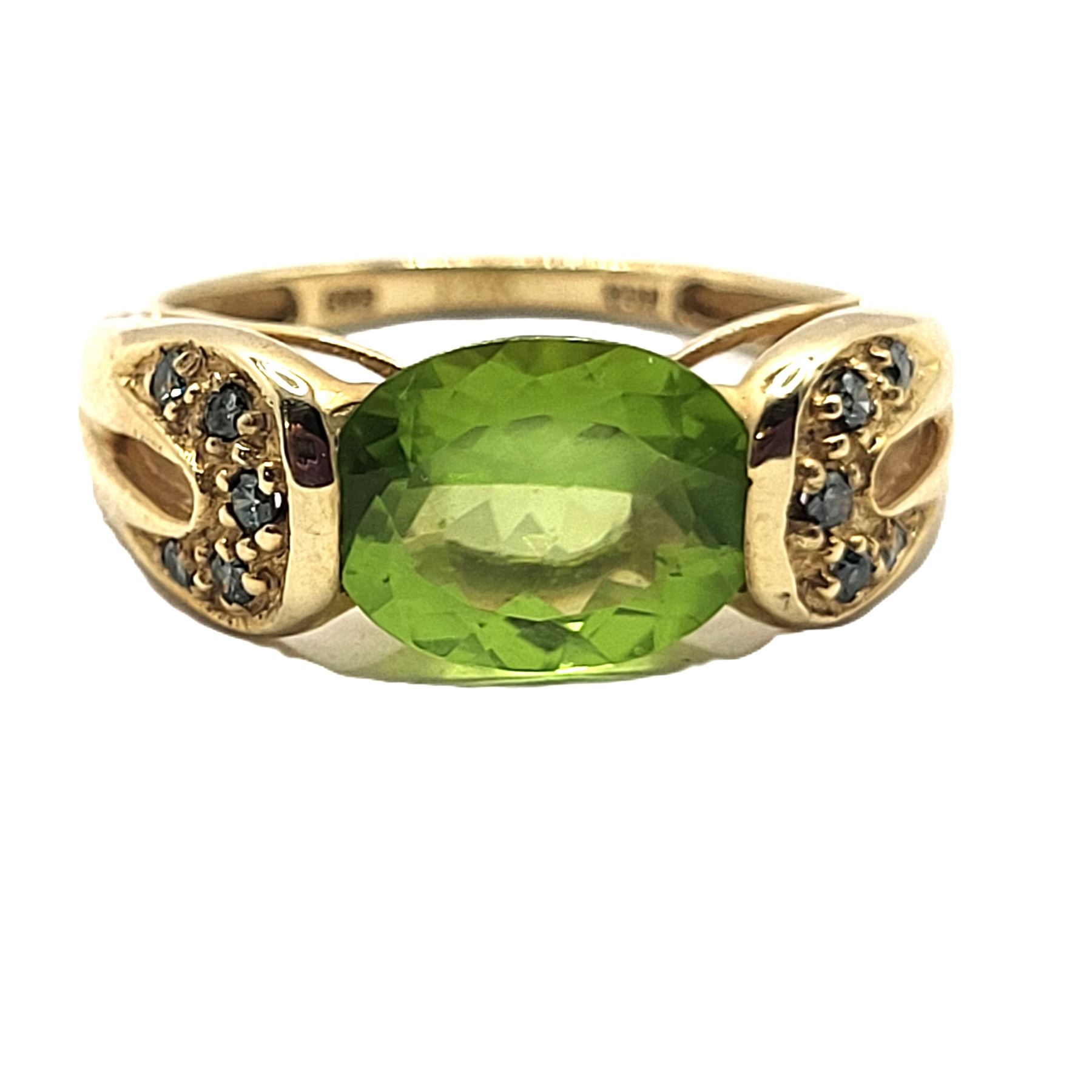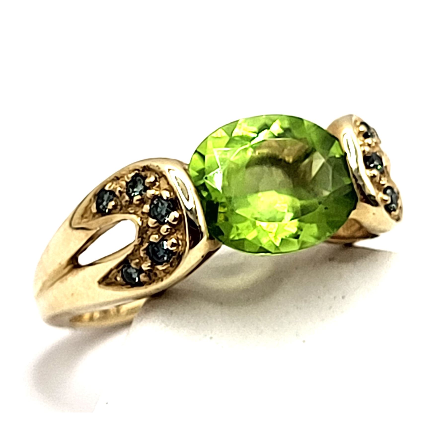 This is a 14 karat yellow gold ring with an approximate 2.50 carat oval-cut, East-West set, genuine peridot with approximately .10 carats total weight round, brilliant-cut, blue diamonds (approximate SI2) in the cathedral shoulders.& nbsp; The ring is approximately size 7.& nbsp; See sizing details and other information below.