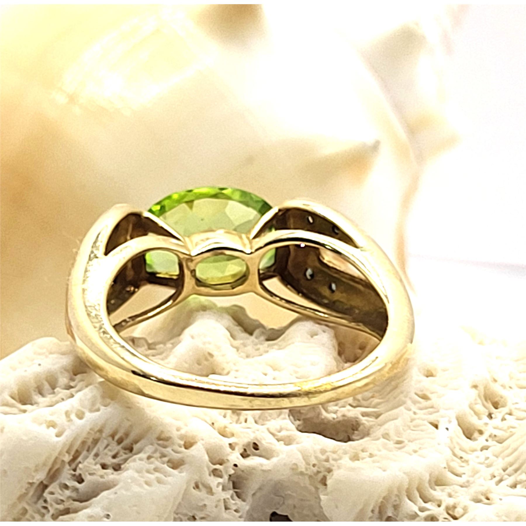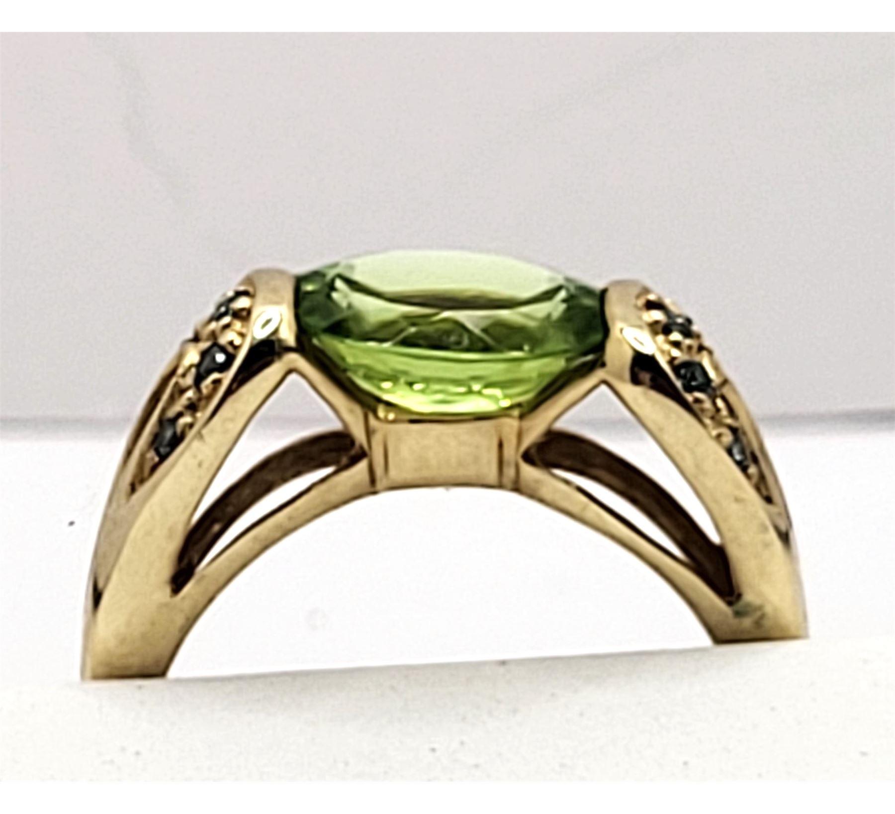The tension-set peridot and blue diamond-studded, looped shoulders set this ring apart from the run-of-the-mill department store rings!