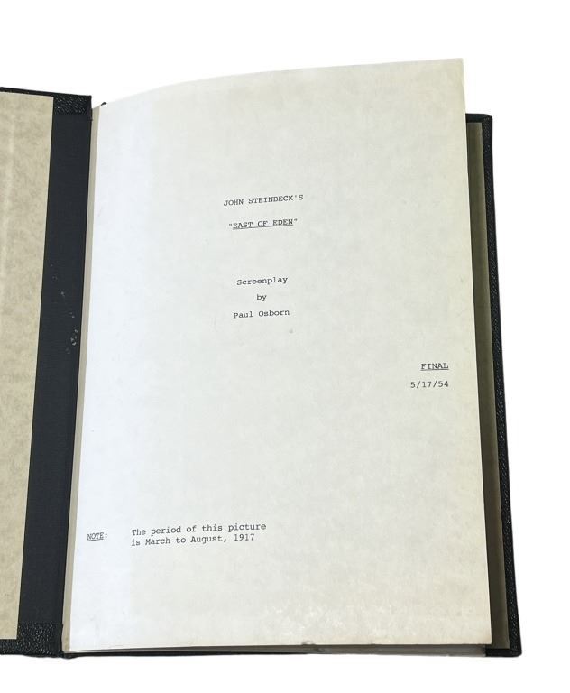 Original bound script for the Elia Kazan directed period drama film 'East of Eden' (1955), starring James Dean as a wayward young man who, while seeking his own identity, vies for the affection of his deeply religious father against his favored brother, thus retelling the story of Cain and Abel. Appearing in supporting roles are Julie Harris, Raymond Massey, Burl Ives, Richard Davalos, and Jo Van Fleet.