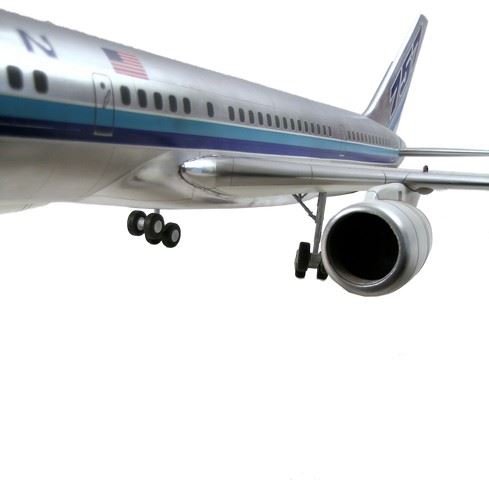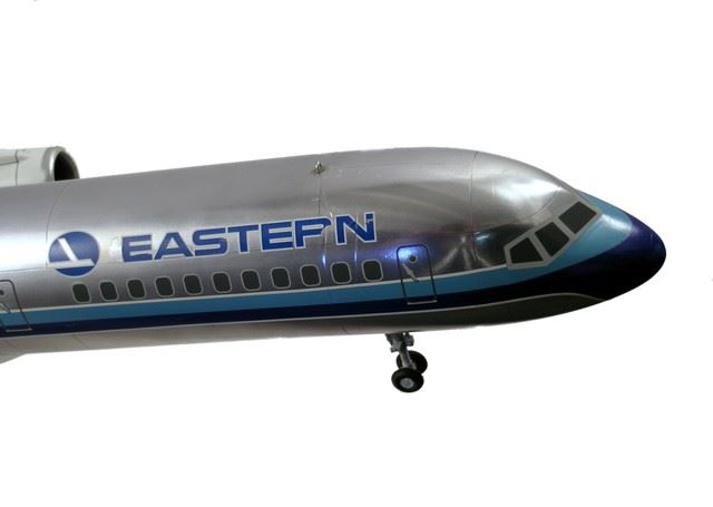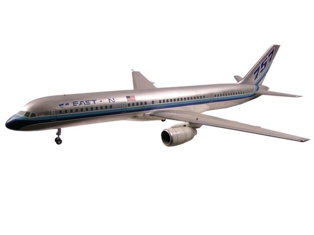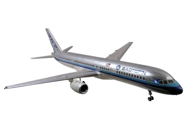 Created for and featured in an Eastern Airlines commercial, this miniature 757 is made out of fiberglass and wood. It is immaculately painted in metal finish. Created and produced by the Grant McCune Design team winner of numerous awards. This is part of the Grant McCune collection. (approx. 47" x 38")