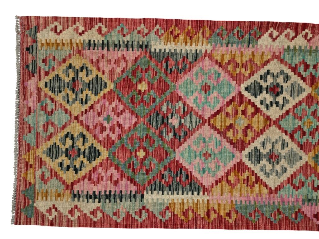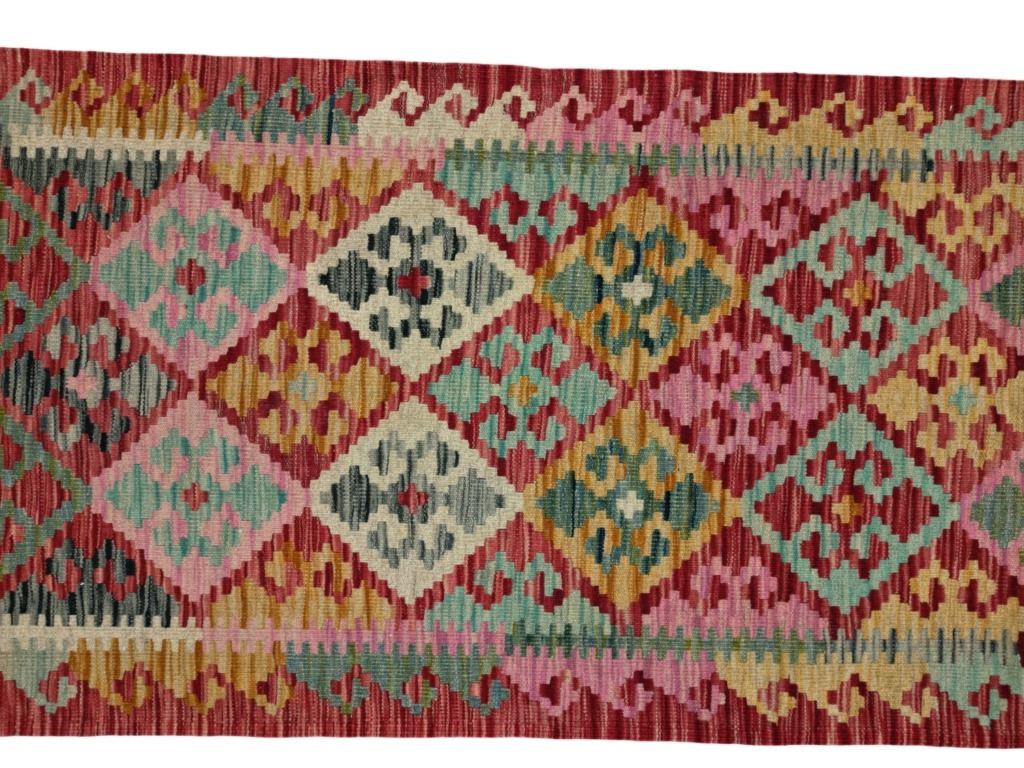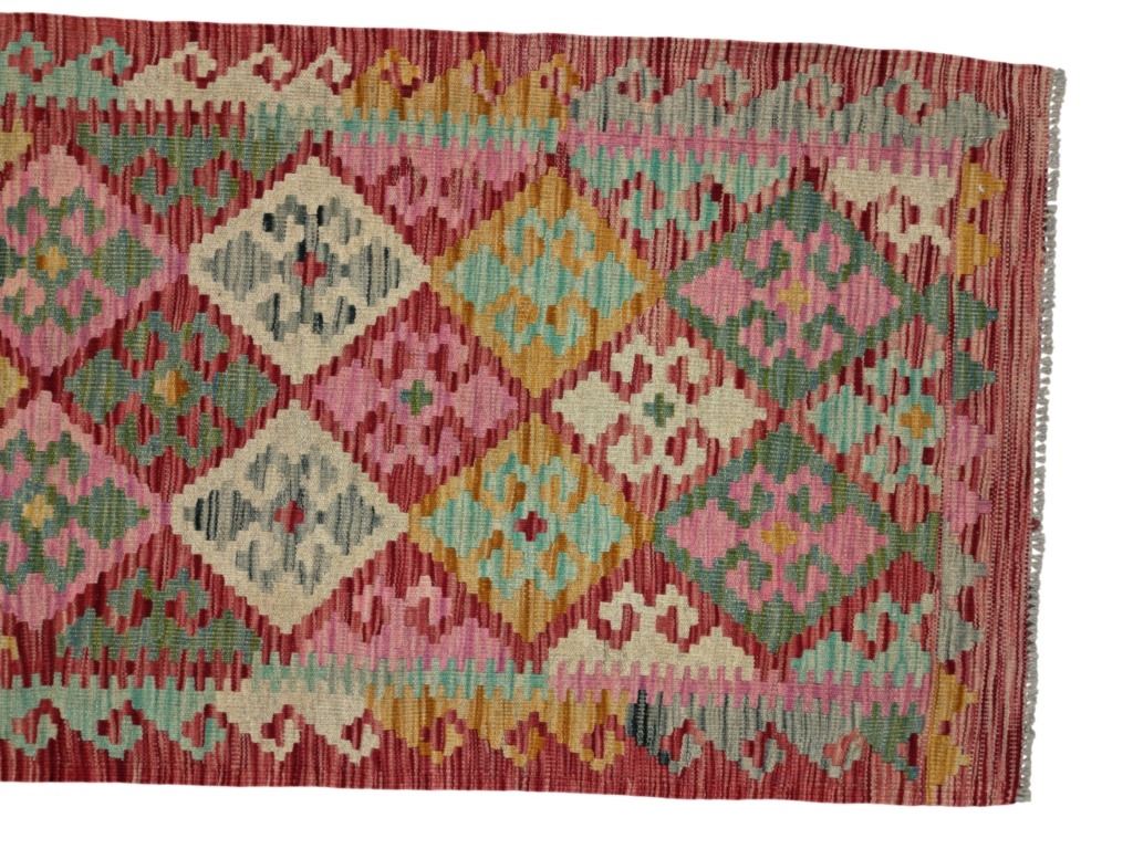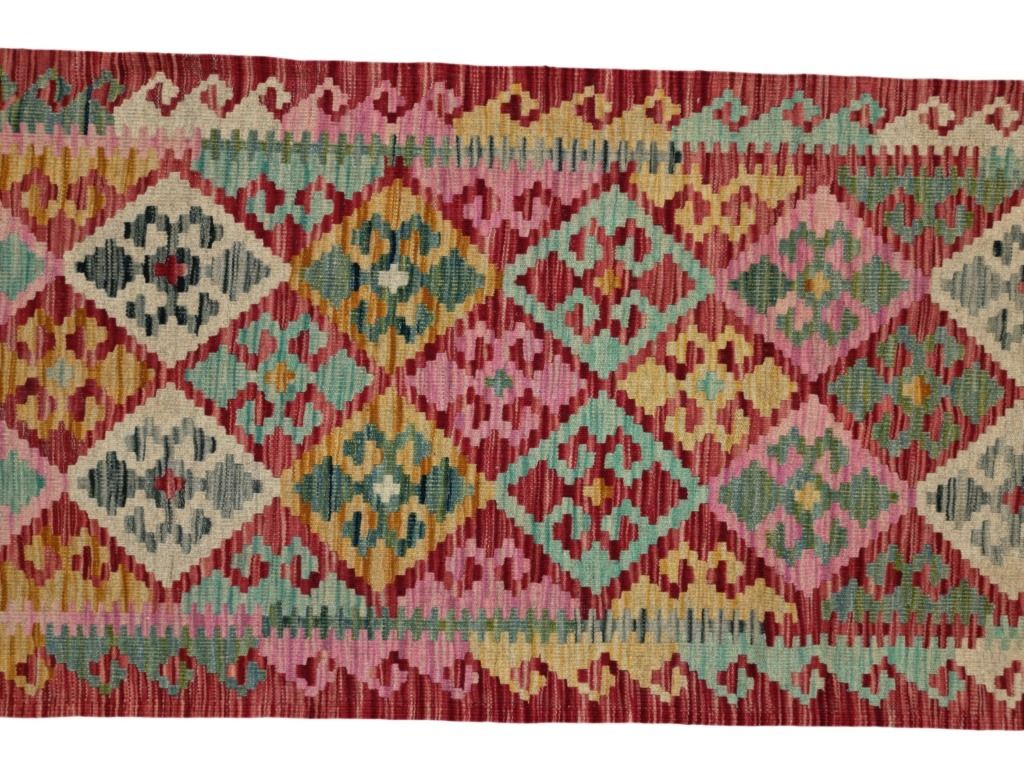 Featured in this lot is this Eastern Anatolian Caucus Tribal Kilim. The kilim features a wonderfully and professionally handcrafted wool construction that features medallions of geometric motif patterns throughout and naturally dyed colours such as red, sage green, pink, light blue, grey, saffron yellow, mustard yellow, cream white and orange. Anatolian motifs represent desires, such as for happiness and children; others, for protection against threats such as wolves (to the flocks) and scorpions, or against the evil eye. The region of Eastern Anatolia borders the Caucasian republics that recently gained independence from the now-defunct Soviet Union; it also abuts Iran, formerly known as Persia. The region has experienced Turkish influence in addition to Kurdish, Azeri, Armenian, Russian and Iranian influence to a greater or lesser degree, some of which is evident in the designs and colouring of weavings made here. The condition of this kilim rug is good with no obvious signs of damage and shows good overall condition. The measurements of this kilim is 33"W x 116"L. S461