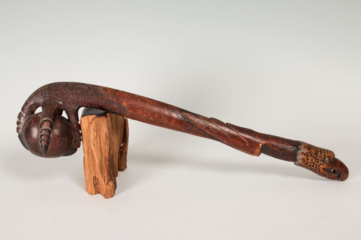 Eastern Ballhead Club. 21" in length. Beautifully carved claw holding ball with a carved eagle head on opposite end. Fine patina on wood. Probably used as a dance club. 19th century.