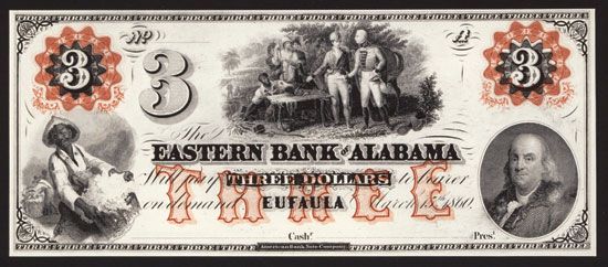 Eufaula, AL. 1860 (ca. 1960-70), $3, AL-15-G6a, Modern Proprietary proof printed in black on red underprint on thin white card, back blank with blue COPY written on it, with slave holding basket of cotton on LL, Franklin on LR and Sweet potato dinner in middle top, pp A; Choice to Gem Uncirculated, ABN. (ABN Commemoratives, AIA XI, May 15, 2012)