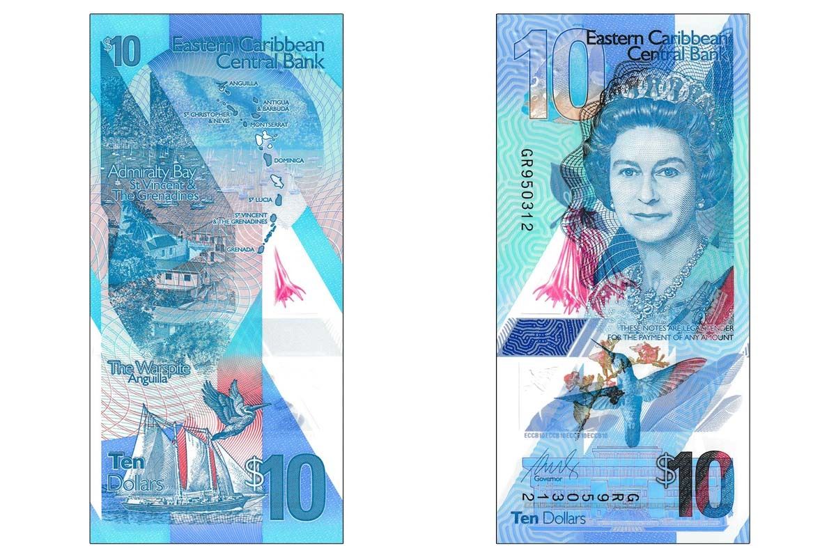 Eastern Caribbean Islands, Queen Elizabeth II (c. 1952-date), 10 Dollars, 2008 issue, Obv. Portrait of Queen Elizabeth II, ECCB building, Turtle, Green-throated Carib (Eulampis jugularis), and Fishes; Rev. Admiralty Bay in Saint Vincent and The Grenadines, Map of the Eastern Caribbean islands, The Warspite sailing ship, Anguilla, Brown Pelican (Pelecanus occidentalis), and Fishes, (P#48), UNC, Rare.