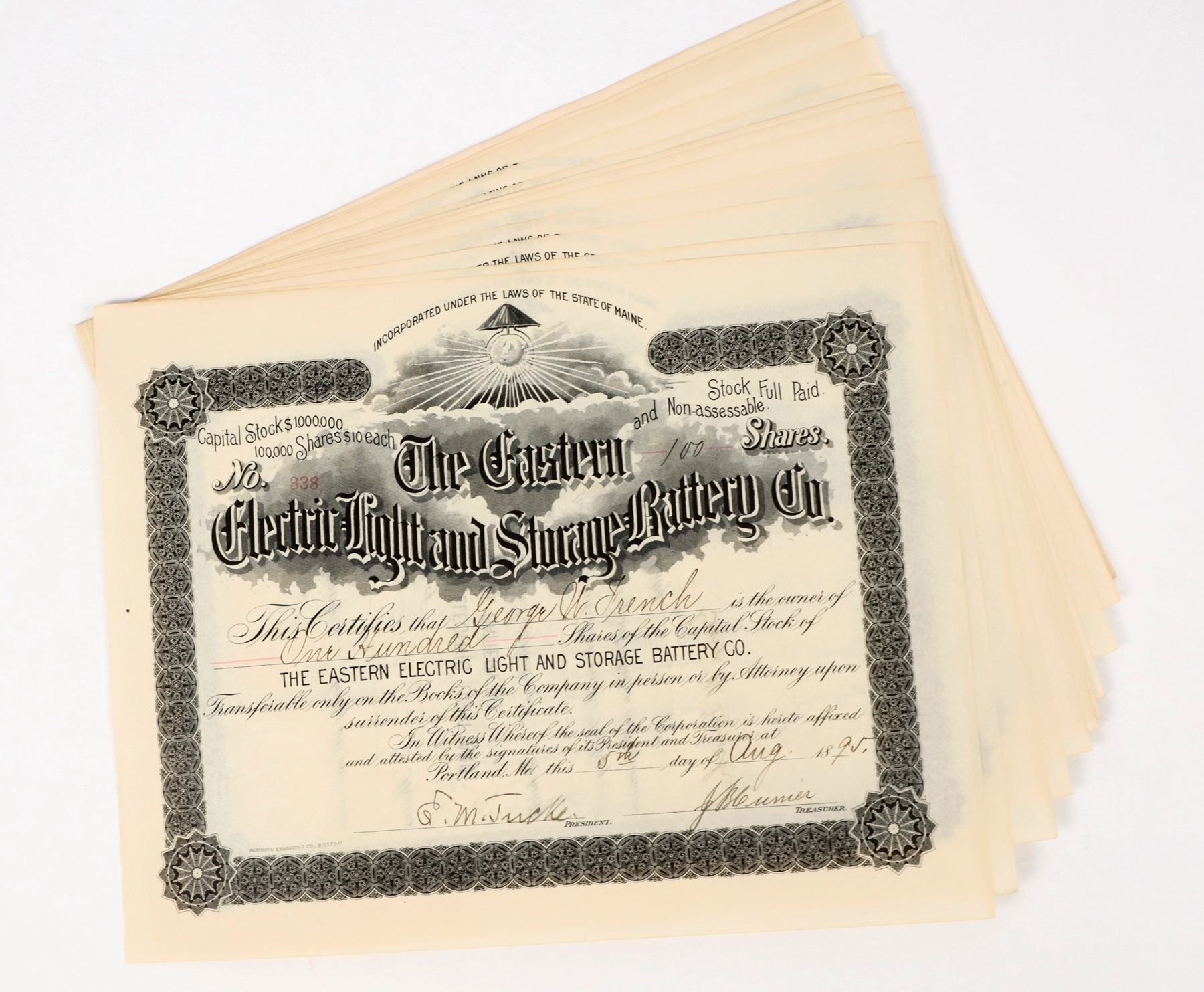 This is a lot of twenty stock certificates for the Eastern Electric Light and Storage Company on Maine. All are issued to a George W. French in 1895. This is an early company for electric lighting. Please see photo for details.