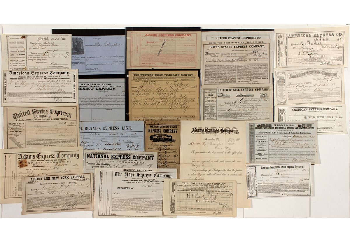 18 Lot of 31; Adams Express (5), Albany NY Express (1), American Express (6), American Merchants Union Express (1), Eastern Express (1), Hope Express (2), James Bland Express (1), Merchants Union Express (2), National Express (1), Phillips Express (1), United States Express (5), Wells & Co Express (2), Wells Fardo Express (1). Lynn Langdon Collection - HKA#65681