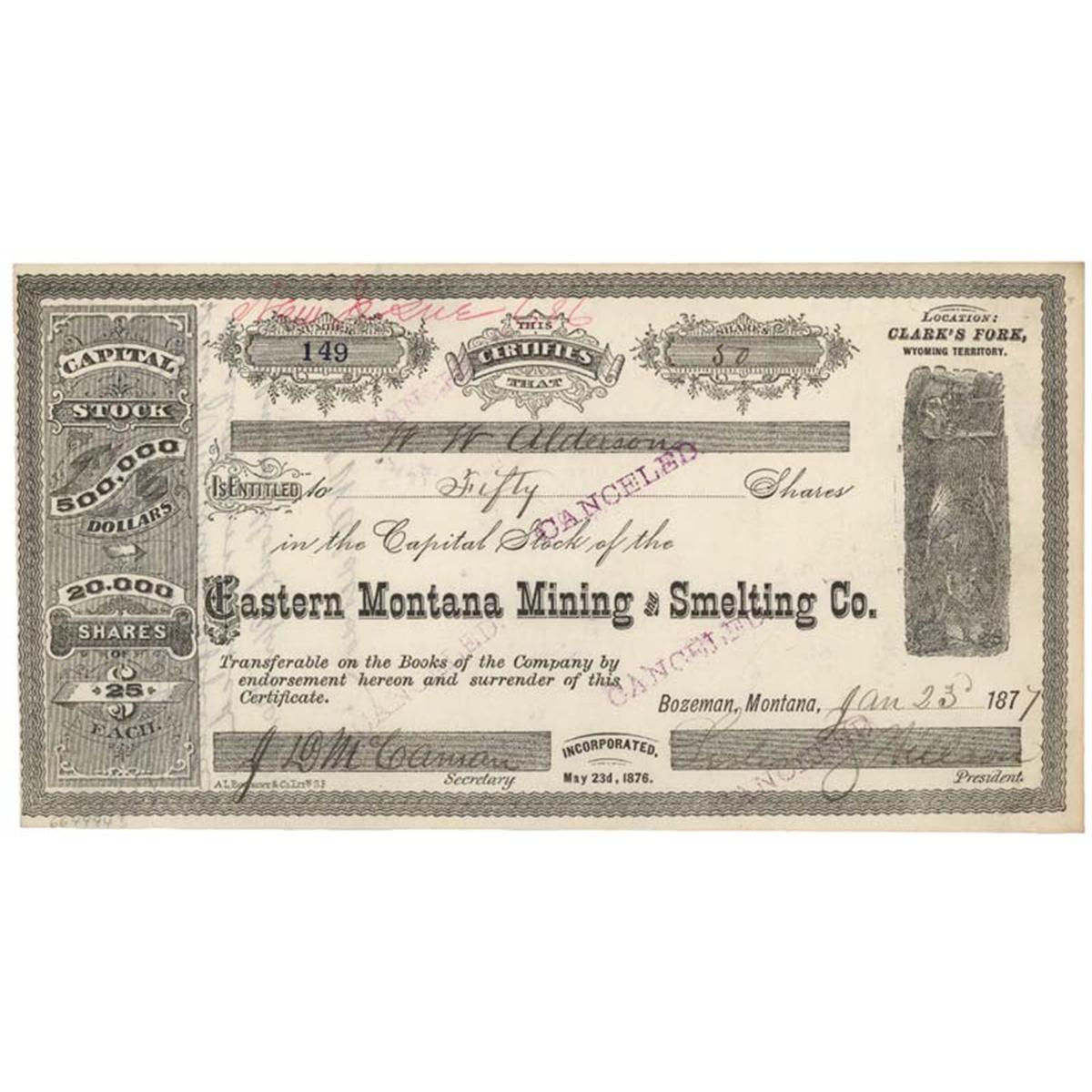 1877, Bozeman, Montana. Stock certificate for 50 shares. Black. Vertical vignette at right of miners working in a shaft. Mine located at Clark's Fork, Wyoming Territory. Pen and stamp cancelled. Excellent condition.