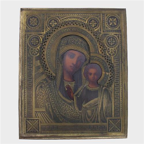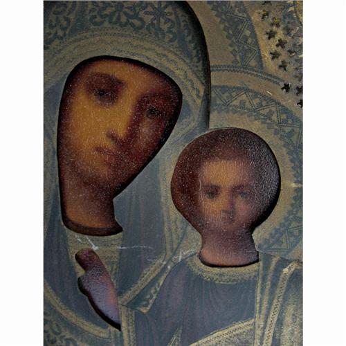 Eastern Orthodox icon; Mary and Baby Jesus; engraved brass over oil on wood; 10 1/2" x 8 3/4"; crazing