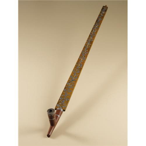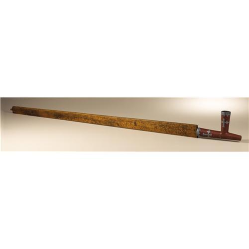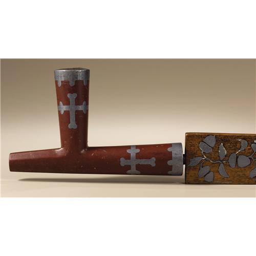 <B>Eastern Sioux Council Pipe with Ornate Lead Inlaid Stem and Bowl</B></I><BR>Circa 1865<BR>Length 47 in. overall<BR><BR>This council pipe has a flat and slightly tapering ash wood stem, elaborately decorated along its length with lead inlay in a pattern of acorns and leaves. The catlinite "T" shaped bowl is inlaid with two bands of crosses, their form reminiscent of Christian crosses made by Montreal silversmiths for the Indian trade.<BR>Before the advent of fixed ammunition Indian people needed lead bullets for their muzzle loading firearms. Traders supplied both bullet molds and lead to meet this demand. Lead has a low melting point (621º Fahrenheit) so native people easily mastered the technology. Lead inlay was a common decorative element on pipe bowls. However, there are almost no examples of lead inlay being applied to pipestems. This stem is notable for its unique and lavish inlay.<BR><BR>Provenance<BR>Ralph Olson, Deerfield, Illinois.<BR><BR>
