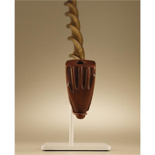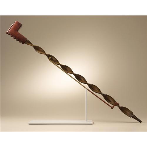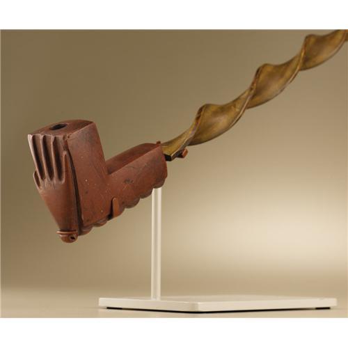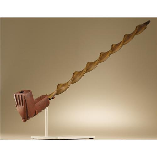 <B>Eastern Sioux Pipe Bowl and Stem</B></I><BR>Circa 1870<BR>Length 28 1/2 in. overall<BR><BR>The ash wood stem has been carved in an even spiral pattern its entire length. An elbow shaped catlinite bowl is fitted to the stem. An open hand is carved in relief on the front of the bowl and a scalloped pattern on the underside.<BR>Spiral carved or "twisted" pipestems were popular in the western Great Lakes (Chippewa, Potawatomi, Menominee, and Winnebago) and extended to both the Eastern Sioux (Dakota) and Western Sioux (Lakota). Contrary to some references and conjecture, the wood stem was not steamed and twisted. Rather, it was patiently worked, the artist taking care not to break into the smoke channel. Fine examples such as this represent the sophisticated product of the carver's art.<BR><BR>Provenance<BR>Brant Mackley, Hummelstown, Pennsylvania.<BR><BR> <BR><BR><B>Important no