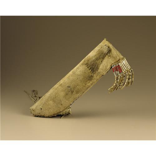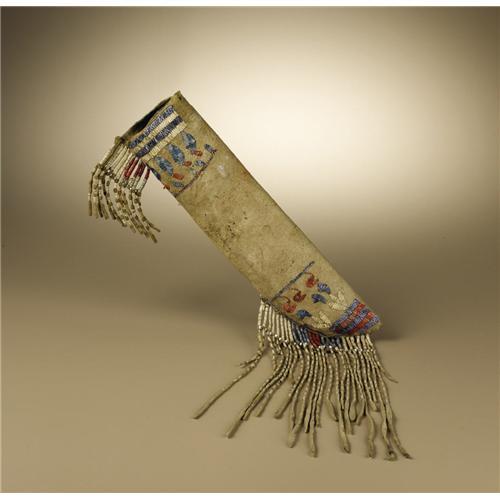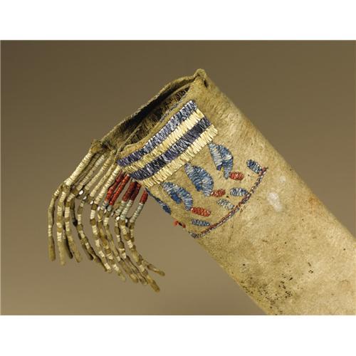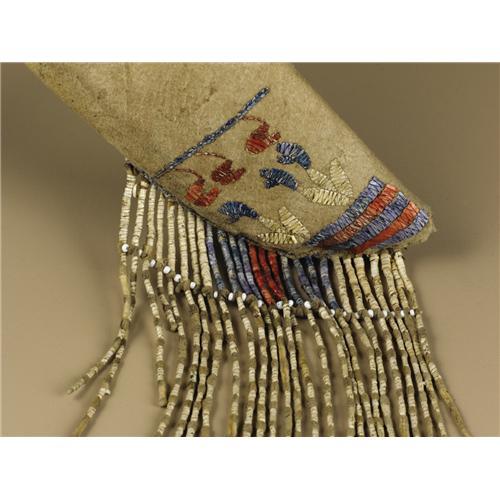 <B>Eastern Sioux Quilled and Fringed Buffalo Hide Knife Sheath</B></I><BR>Circa 1850<BR>Length 11 3/4 in.<BR><BR>This native tanned buffalo hide case is partially decorated with porcupine quillwork. Floral designs executed in red, white, and blue quills are bordered by alternating rows of plaited quillwork in blue and white and blue and red. Quill wrapped hide fringe decorates the upper and lower edge. The sheath is fitted with a buffalo rawhide liner.<BR><BR>Provenance<BR>Deaccessioned from the Memorial Hall Museum, Deerfield, Massachusetts. This knife case is listed as number 19 in the collection of relics as published by the Pocumtuck Valley Memorial Association in Deerfield (1920). The knife case was collected by Francis Thompson, a local judge and historian from Greenfield, Massachusetts (1833-1916). This lot is accompanied by documents from the museum.<BR><BR>