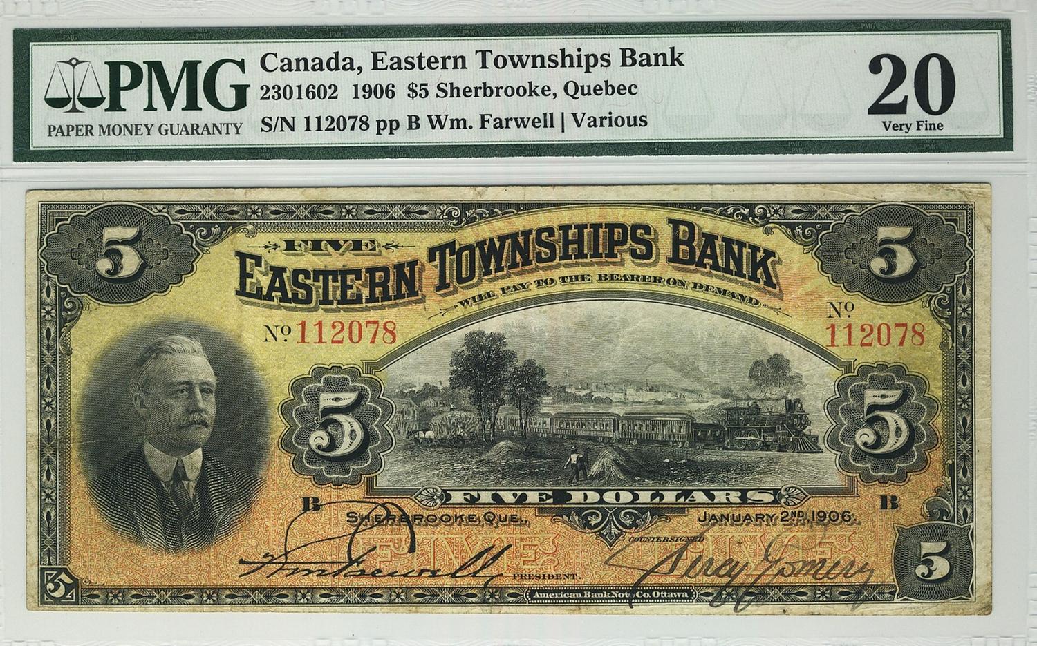 Eastern Townships Bank 1906 $5 112078 CH-230-16-02 PMG VF20. Excessively rare and desirable.