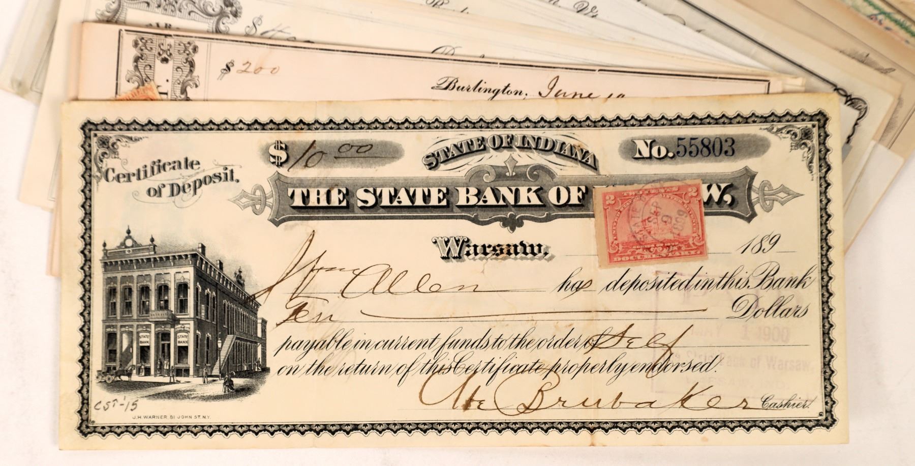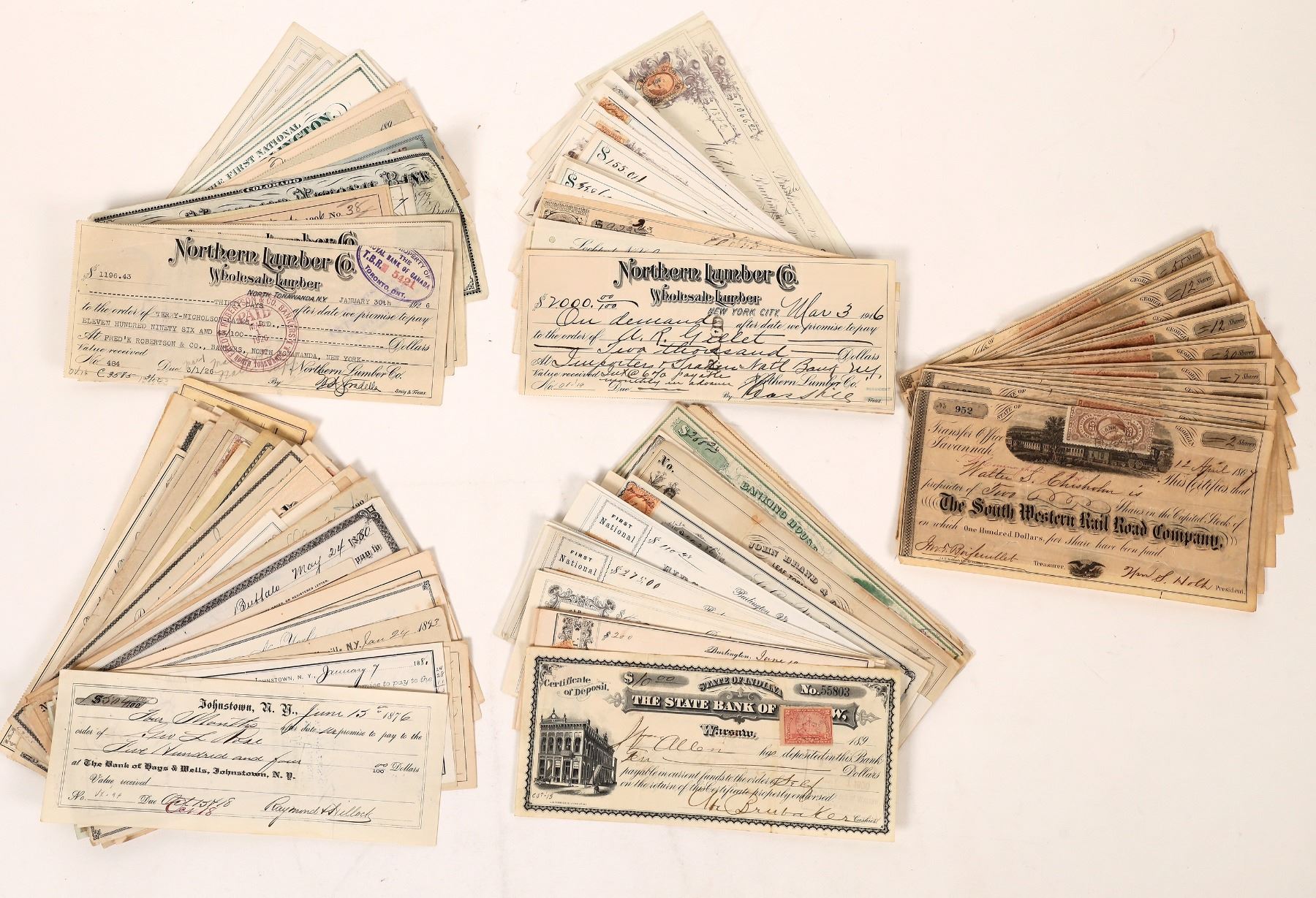 About 100 or more nice mostly Eastern US checks, c. 1864-1926. Some have adhesive revenue stamps, vignettes, Indian Territory, NY, PA, VT, VA, OH, OK etc. c. 1864-1926