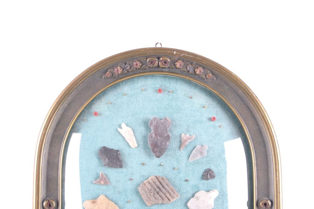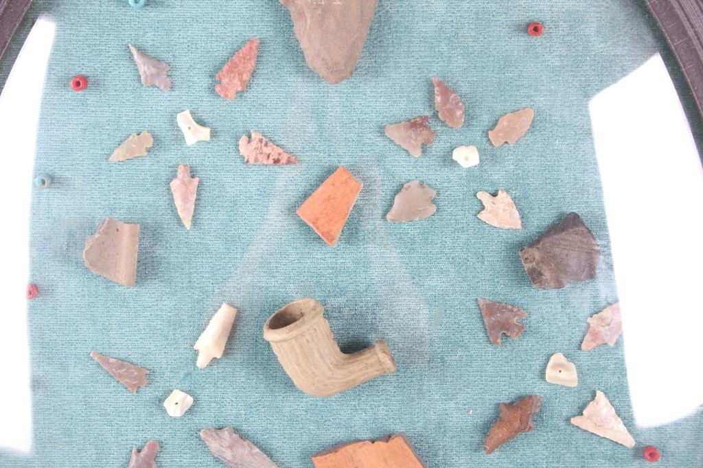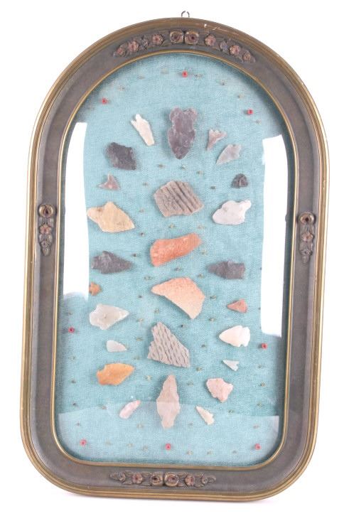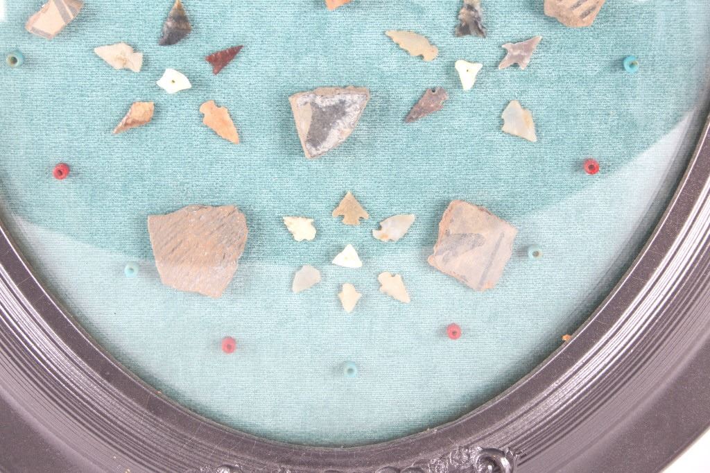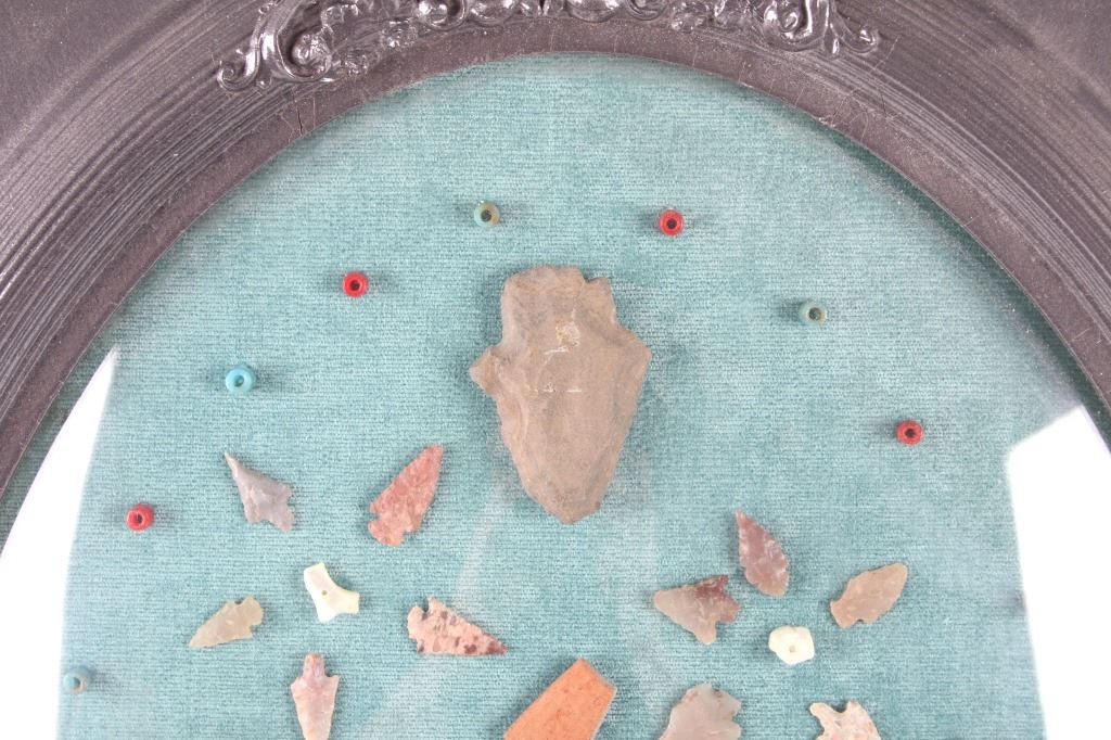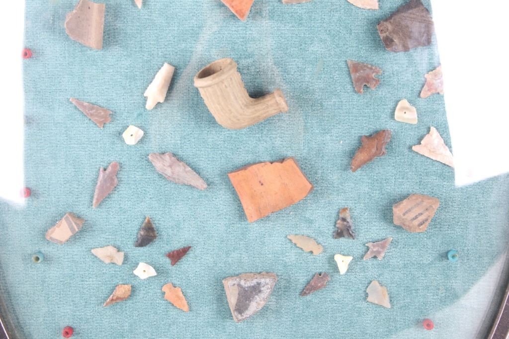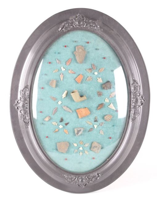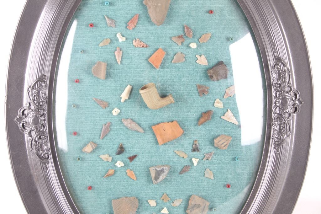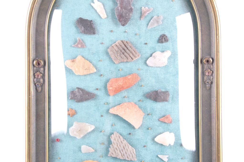 Featured in this lot is this paleo archaic Eastern Woodlands stone points and artifacts collection. There are 81 total arrow heads and artifacts in this double display collection. The artifacts include pottery shards with polychromal colors with multiple small points and shows a archaic pipe bowl in a 90 degree stature. The displays are bordered by trade beads and small adornments all set on teal velvet with an arched glass with floral accent frames. The condition of this collection of points and artifacts is well preserved with no obvious signs of damage to the artifacts and the displays and shows a well preserved overall condition. The measurements of this collection of points and artifacts is 22" x 13 3/4" x 1" and 24 1/4" x 18 1/4". The collective weight of this collection is 9lb 8oz.
