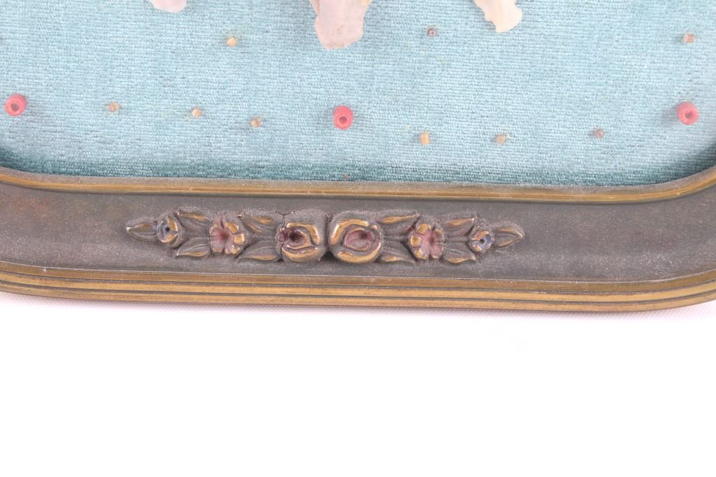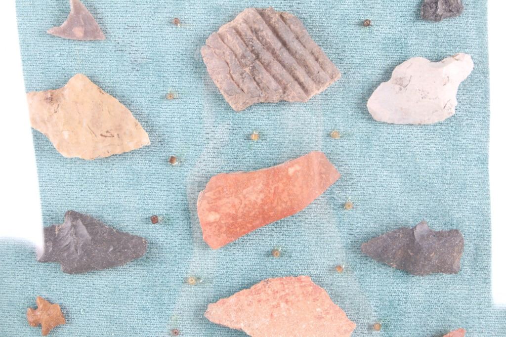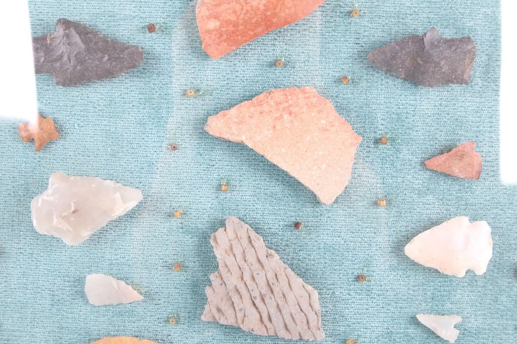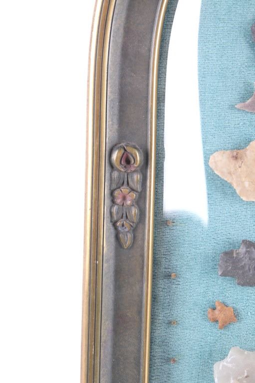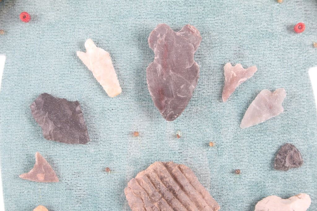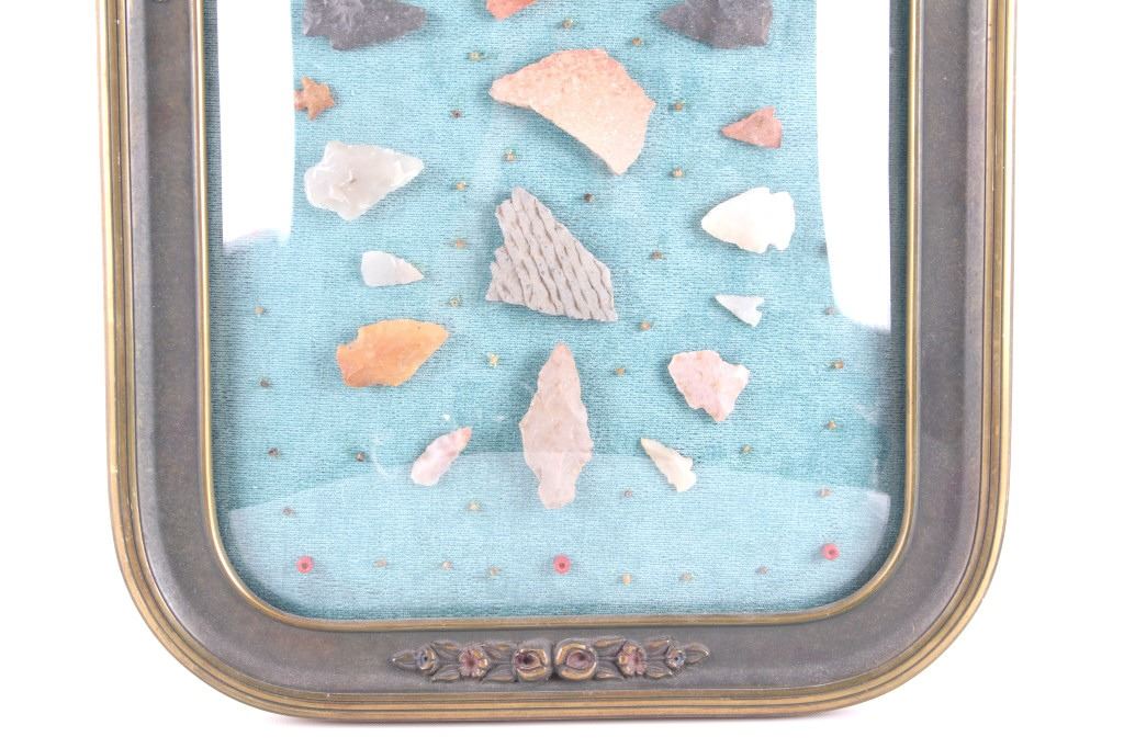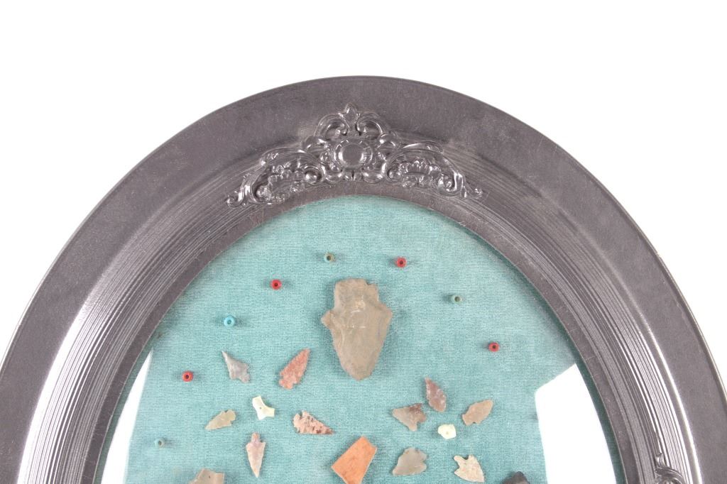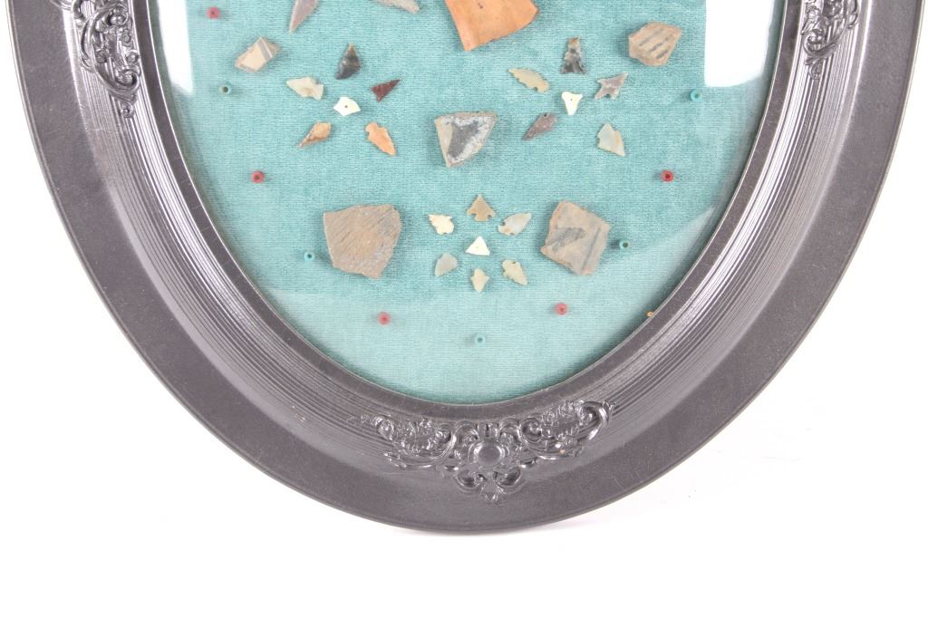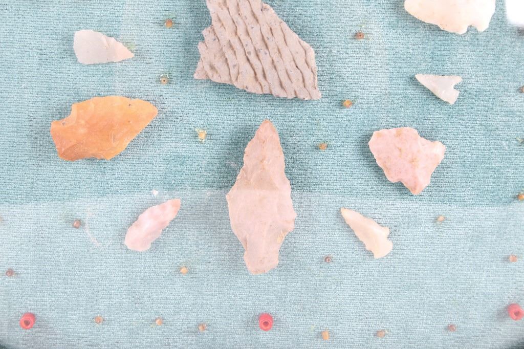 Featured in this lot is this paleo archaic Eastern Woodlands stone points and artifacts collection. There are 81 total arrow heads and artifacts in this double display collection. The artifacts include pottery shards with polychromal colors with multiple small points and shows a archaic pipe bowl in a 90 degree stature. The displays are bordered by trade beads and small adornments all set on teal velvet with an arched glass with floral accent frames. The condition of this collection of points and artifacts is well preserved with no obvious signs of damage to the artifacts and the displays and shows a well preserved overall condition. The measurements of this collection of points and artifacts is 22" x 13 3/4" x 1" and 24 1/4" x 18 1/4". The collective weight of this collection is 9lb 8oz.