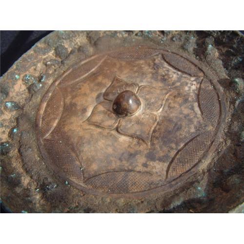 Unique Eastern Zhou period, most probably an imperial funerary jade consisting of a bronze disk decorated in high relief with knobs that have emerald color patina and encrustations. The central portion of the bronze disk has a green jade inlaid decoration of circular form and decorated with floral pattern ornaments. The reverse side is convexe and is not decorated. Most likely it represents an imperial funerary mirror. Diameter: 6" (15 cm.). Jade disk diameter: 3.8" (9.5 cm.). Estimated value: $10.000. Provenance: Dr. Veleanu's jade collection, the author of the illustrated collectors' textbook: "Jade, 5000 BC to 1912 AD, Guide to collectors".