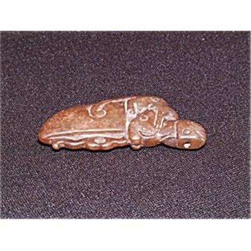 Yellowish brown jade carving dating to Eastern Zhou period. It represents a dragon seated on top of a hatchet. Size: 1.3 X 2.9 inches (3.5 X 7.3 cm.).
