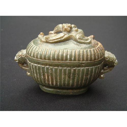 Eastern Zhou period (Warring States) green jade carving in shape of an oblong container having 2 handles carved in open work with zoomorphic design. The sides have vertical grooves decorations. The same pattern continues on the lid that has a seated dragon forming the handle. This is a very rare jade carving of superlative quality seen during Eastern Zhou period as a peak of ancient Chinese arts epoch. There is superficial jade pitting and fossilization attesting to the authenticity of the item. Provenance: Dr. Veleanu's jade collection, the author of the collectors textbook: "Jade, 5000 BC to 1912 AD, Guide to collectors", and the owner of Objets d'Art Uniques Internet store. Estimated value: $15.000.