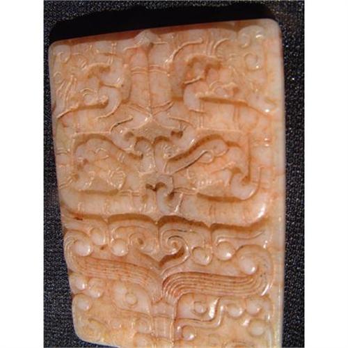 Rectangular yellowish green jade pendant decorated with 4 hydra dragons on upper portion and tao tie mask on lower part. The design is identical on both sides. It dates to Eastern Zhou period and is intact. It appears to be a funerary jade pendant due to the presence of the 4 dragons in the design. Perforated on top for suspension purpose. Size: 2.5" X 1.8" (6.5 X 4.5 cm.).
