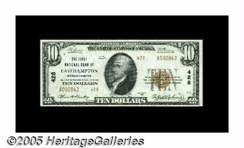 <B>Easthampton, MA</B></I> - $10 1929 Ty. 2 <B>The First NB</B></I> Ch. # 428<BR>This is arguably <I>the</B></I> most available Type 2 $10 in uncirculated condition. Today's growing population of collectors owe a debt to those who came prior and preserved such aspects of our economic heritage. <B>Choice Crisp Uncirculated.</B></I>