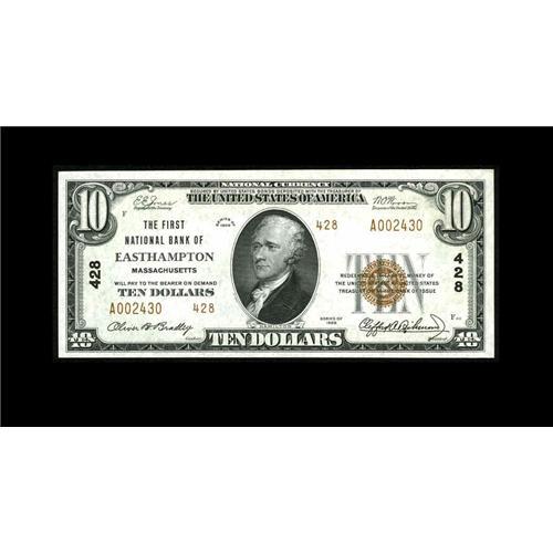 <B>Easthampton, MA</B></I> - $10 1929 Ty. 2 <B>The First NB</B></I> Ch. # 428<BR>Today's growing population of collectors owe a debt of gratitude to the previous generation that saved this issuer in some quantity in top grade. This example is a pack fresh <B>Gem Crisp Uncirculated</B></I> with paper so pristine that it could have been pulled from the press within the last few days.