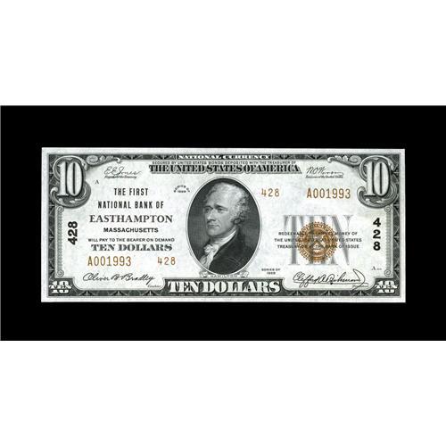 <B>Easthampton, MA</B></I> - $10 1929 Ty. 2 <B>The First NB</B></I> Ch. # 428<BR>A perfectly margined face is hindered only by a hint of handling. An attractive Type 2 $10 that grades <B>Choice Crisp Uncirculated.</B></I>