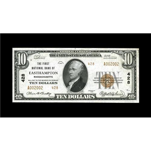 <B>Easthampton, MA</B></I> - $10 1929 Ty. 2 <B>The First NB</B></I> Ch. # 428<BR>Perfectly centered, but with just a touch too much handling for the gem grade. <B>Very Choice Crisp Uncirculated.</B></I>