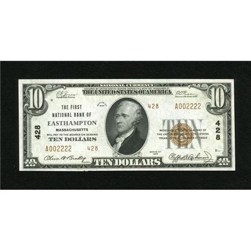 <B>Easthampton, MA</B></I> - $10 1929 Ty. 2 <B>The First NB</B></I> Ch. # 428<BR>This well embossed issue boasts the serial number A002222. <B>Very Choice Crisp Uncirculated.</B></I><BR><BR><b>Shipping:</b> Coins & Currency (<a target="_blank" href="http://www.heritageauctions.com/common/shipping.php">view shipping information</a>)