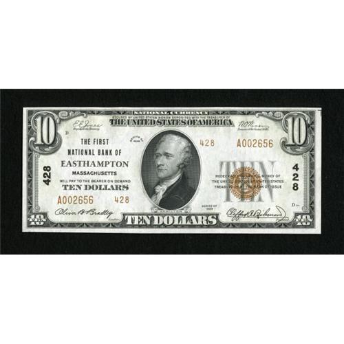 <B>Easthampton, MA</B></I> - $10 1929 Ty. 2 <B>The First NB</B></I> Ch. # 428<BR> A pleasing example of this popular hoard issue. <B>Choice Crisp Uncirculated</B></I>.<BR><I>From The John Ameen Collection</B></I><BR><BR><b>Shipping:</b> Coins & Currency (<a target="_blank" href="http://www.heritageauctions.com/common/shipping.php">view shipping information</a>)
