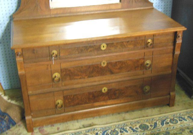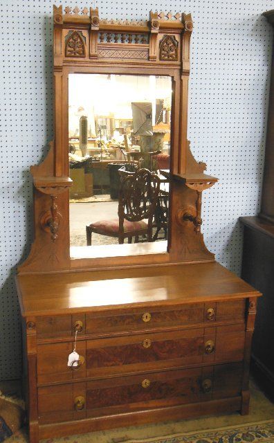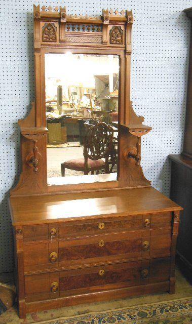 3 Drawer Chest. Mirror has 2 side shelves. Approx. 76" H. X 44" W. X 19.5" Deep.