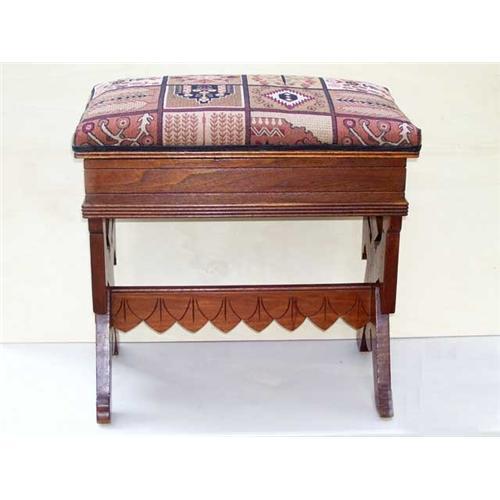 Here we have an Eastlake Sewing Bench. This bench has beautiful carved wood in the Eastlake Style. The top of the bench has been professionally recovered with a wonderful designer tapestry and opens to reveal a storage area. It is in Mint Condition. The piece is from Circa Early 1900's. It measures 17 1/2 inches High, 18 inches long, and 10 1/2 inches wide.