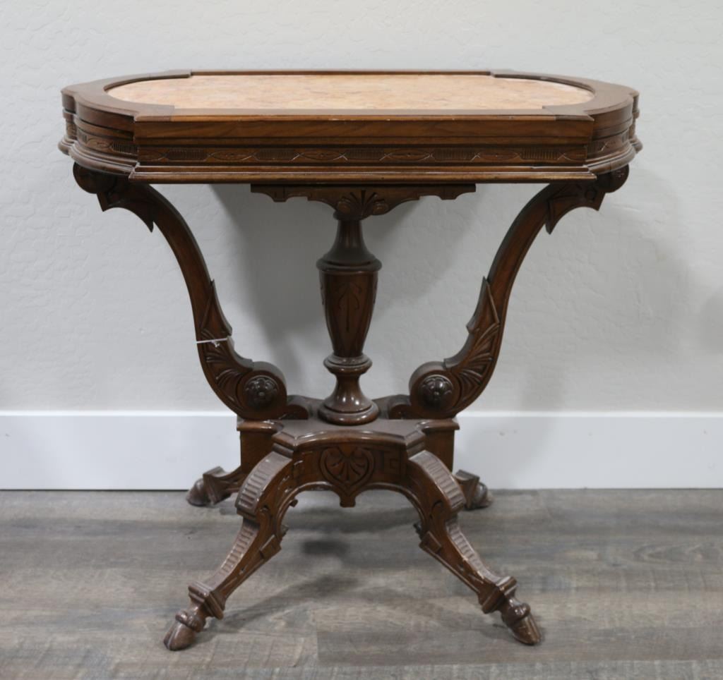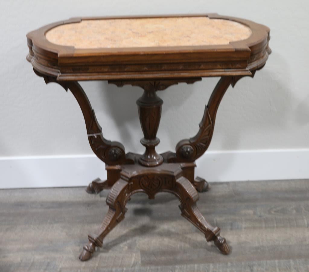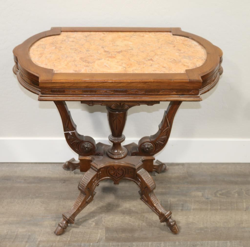 Beautiful walnut carved table with coral colored marble top. Measures 29" tall x 32" wide x 19" deep. Overall very good condition for it's age.