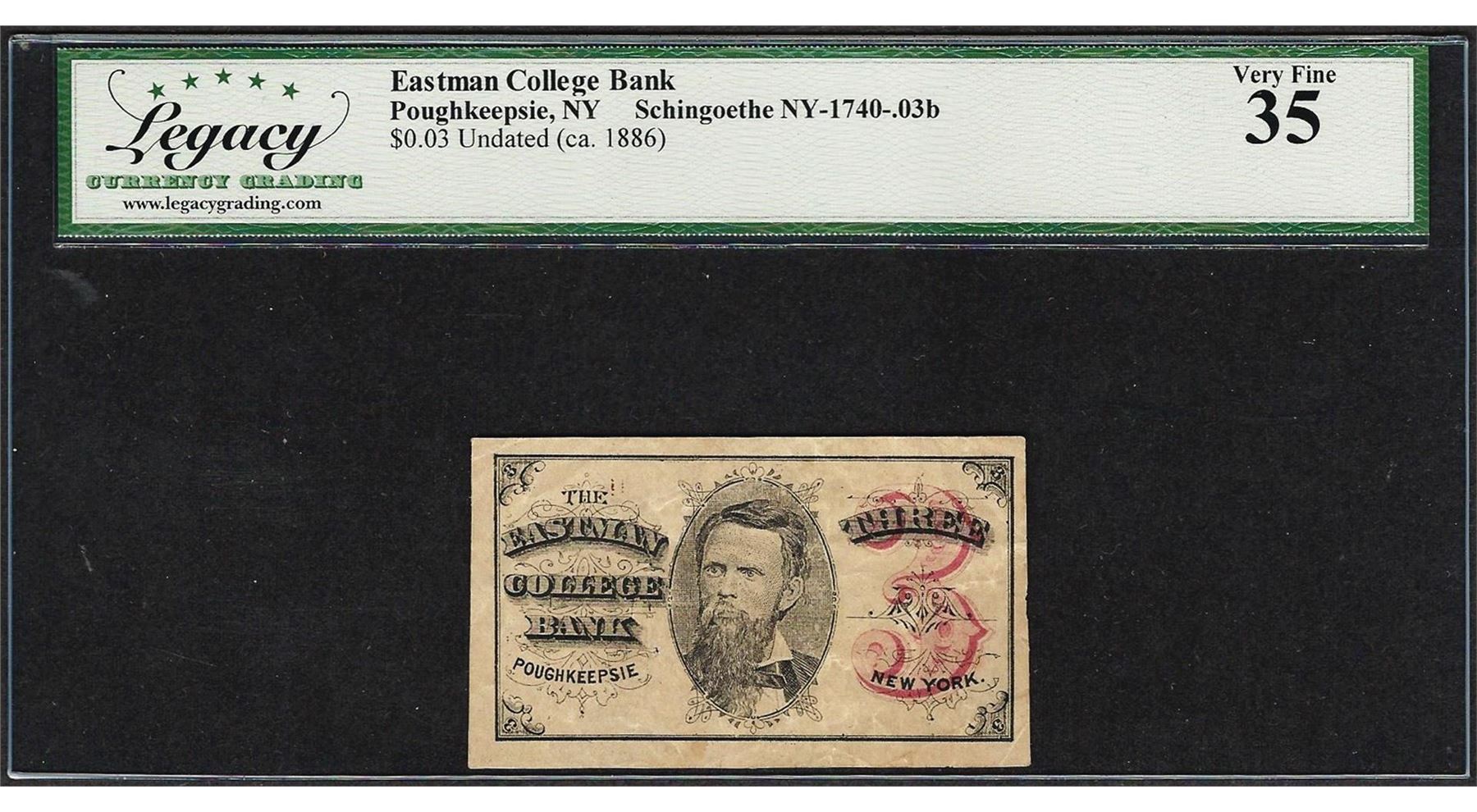 One Eastman College Bank 3 Cents Poughkeepsie, NY Obsolete Note Legacy Very Fine 35. Legacy Graded.