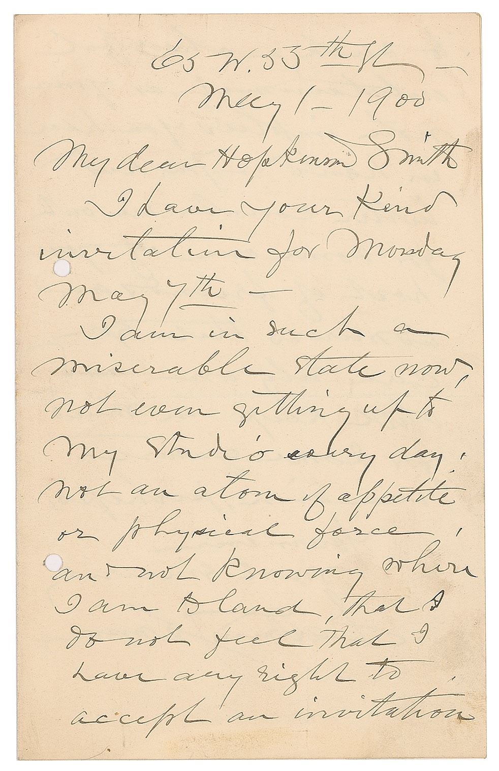 Famed American artist (1824–1906) who earned the moniker the 'American Rembrandt' for his skillful portraits and genre scenes. ALS, one page both sides, 4.25 x 7, May 1, 1900. Letter to Hopkinson Smith, in part: "I have your kind invitation for Monday, May 7th—I am in such a miserable state now, not even getting up to my studio every day; not an atom of appetite or physical force and not knowing when I am to land, that I do not feel that I have any right to accept an invitation to such a cheerful entertainment as your note implies you have in hand." In fine condition, with two small file holes to the left edge.