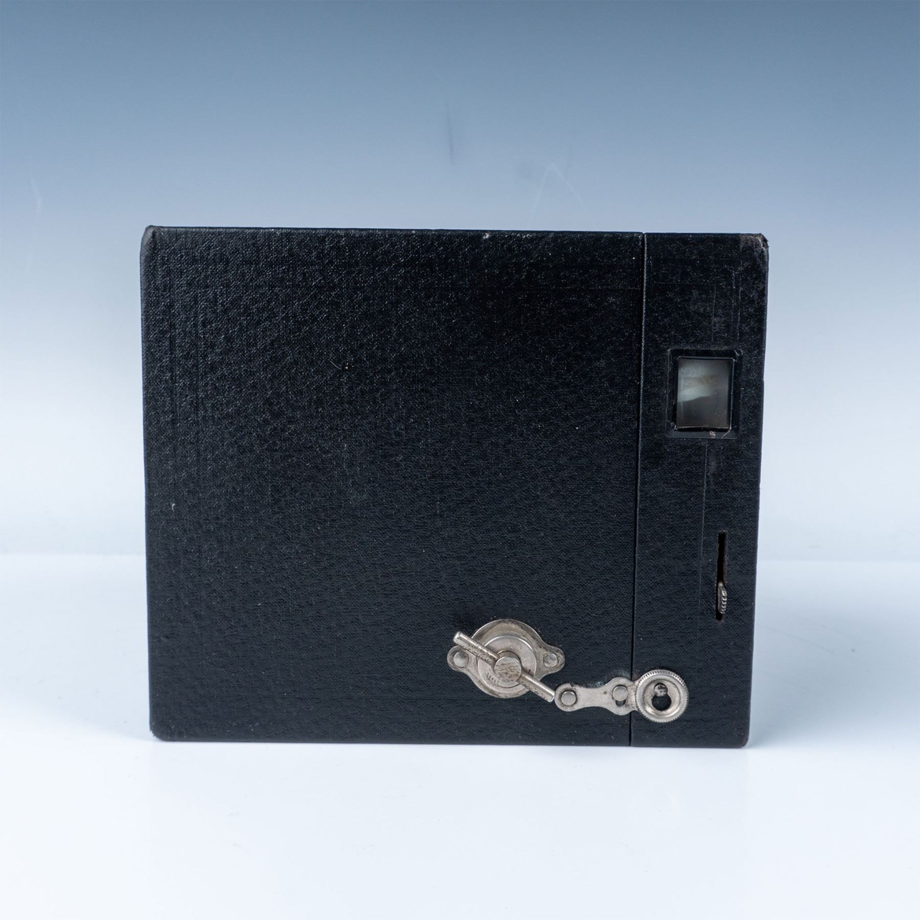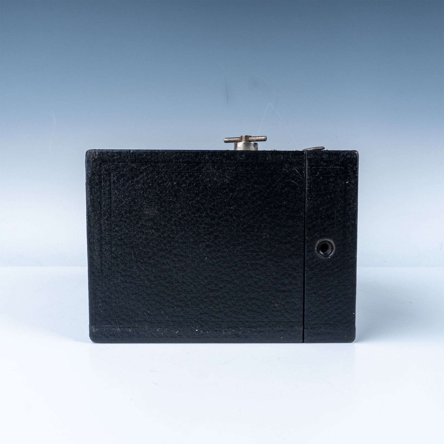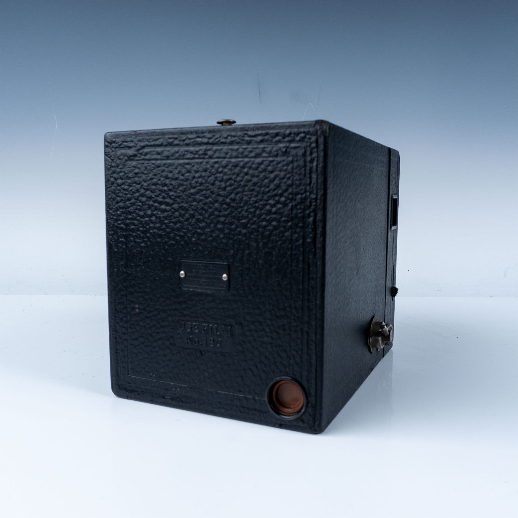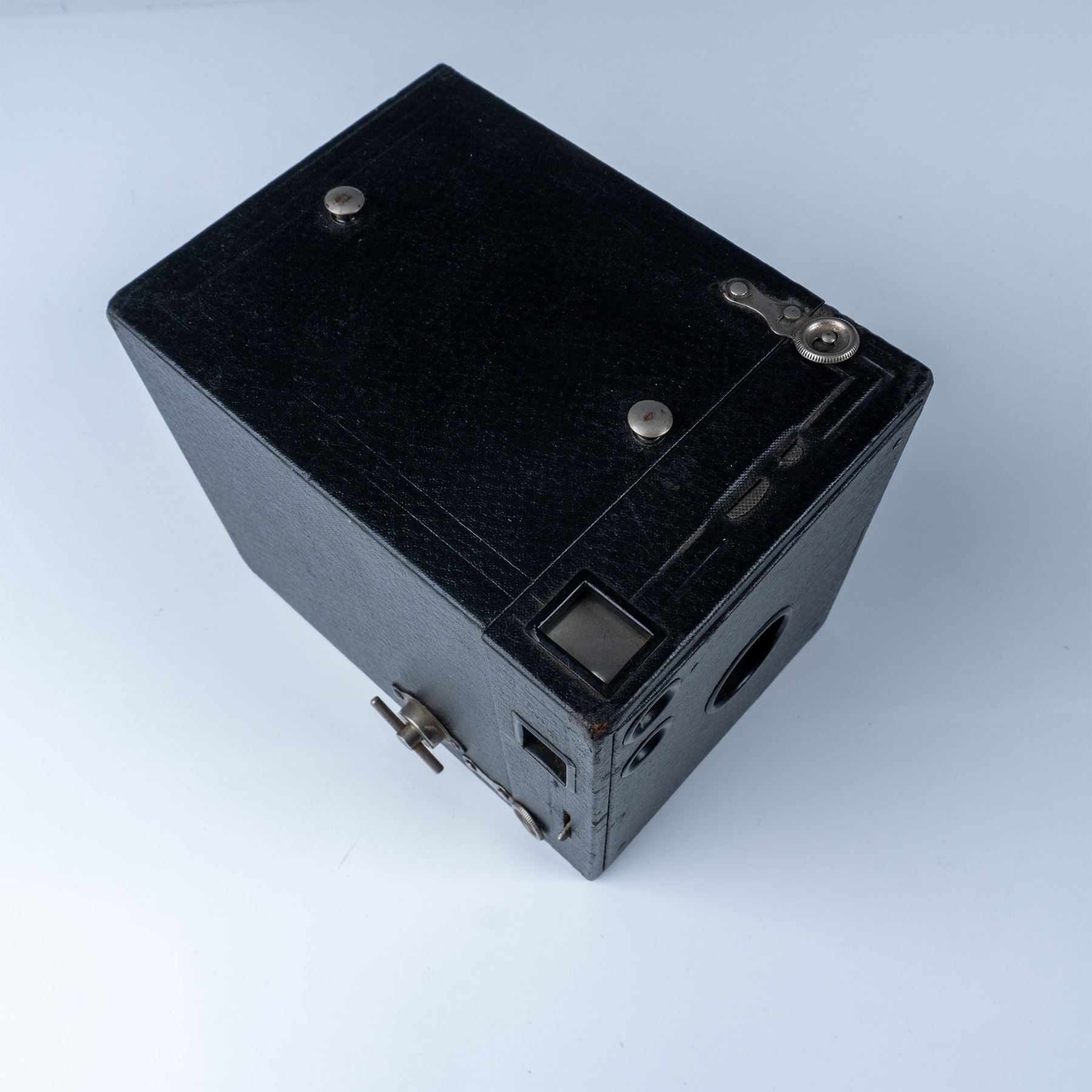 Classic Eastman Kodak vintage box camera, featuring a textured black exterior and a metal shutter mechanism. This camera, likely dating back to the early 20th century, embodies the minimalist design of early photography equipment. Box cameras were popular for their simplicity and affordability, making them ideal for amateur photographers.