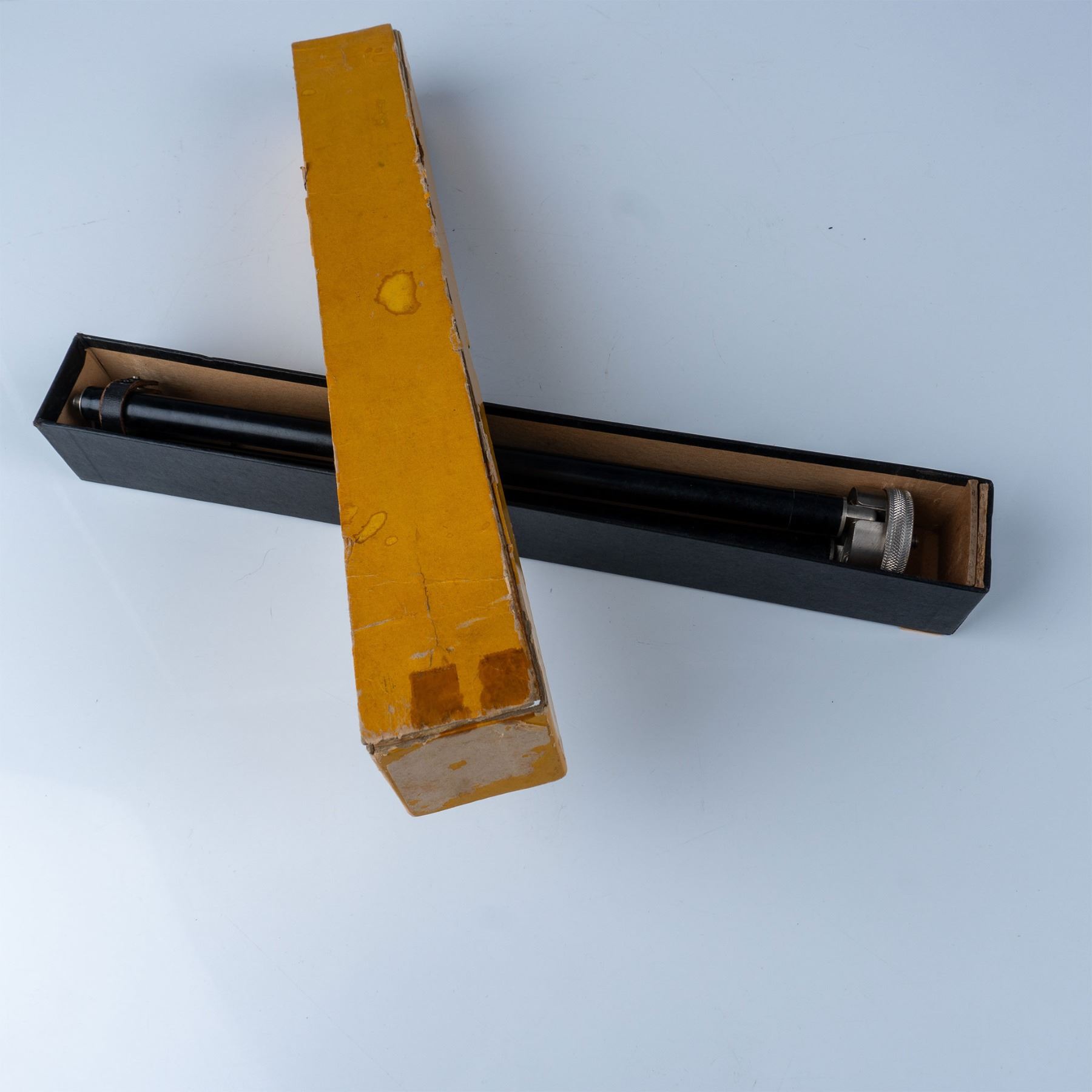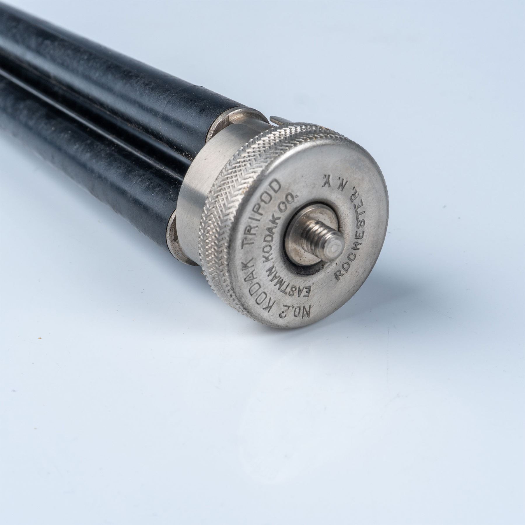 Vintage Eastman Kodak No. 2 tripod, manufactured in Rochester, New York. This compact, foldable tripod is crafted with black metal legs and features a silver-tone top engraved with "Eastman Kodak Co. No. 2 Kodak Tripod." Accompanied by its original box, showing signs of wear consistent with age. A collectible accessory for vintage photography enthusiasts.