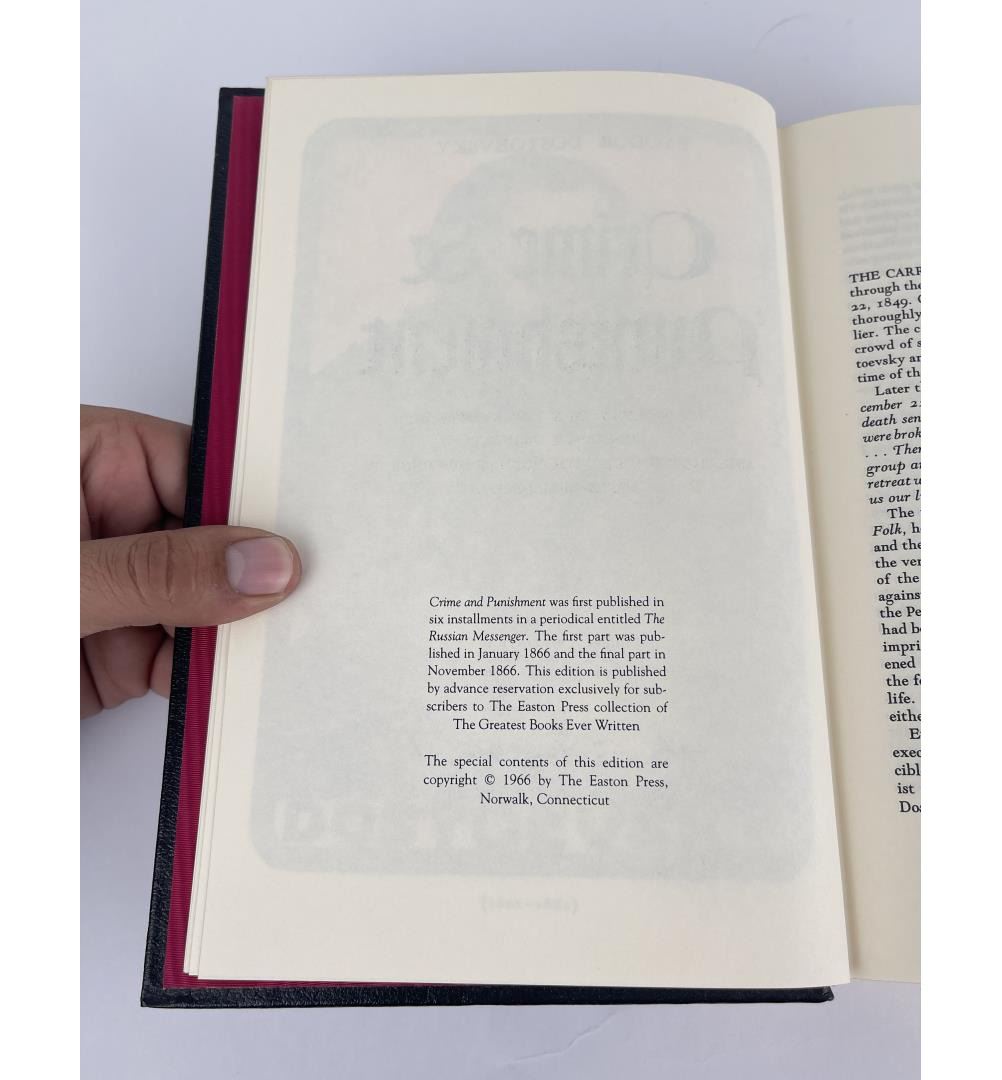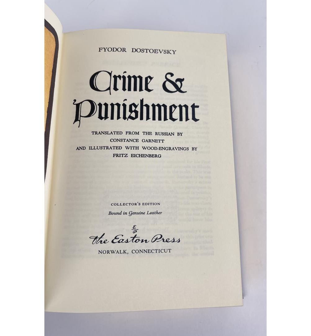 This 1981 collector's edition is beautifully bound in leather with gilt edged pages including ribbon bookmark. Crime and Punishment by Fyodor Dostoevsky was translated from the Russian by Constance Garnett and illustrated with wood engravings by Fritz Eichenberg.