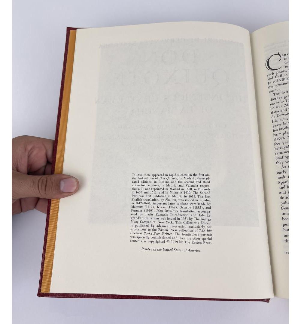 1981 collector's edition, beautifully bound in leather with gilt edged pages including ribbon bookmark. 'Don Quixote the Ingenious Gentleman of La Mancha' by Miguel de Cervantes Saavedra. The translation by John Ormsby with a new introduction by Irwin Edman and the illustrations by Edy Legrand.