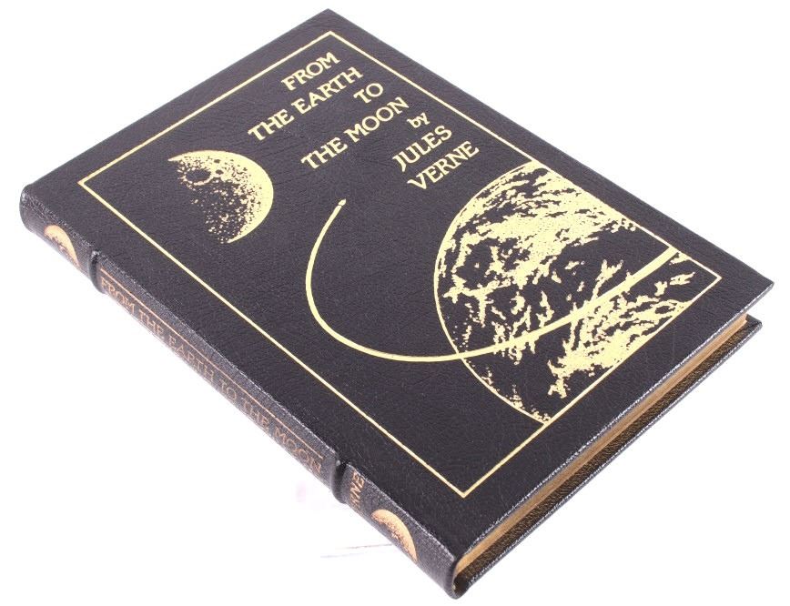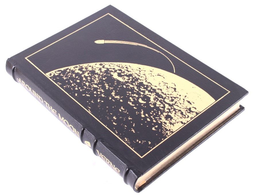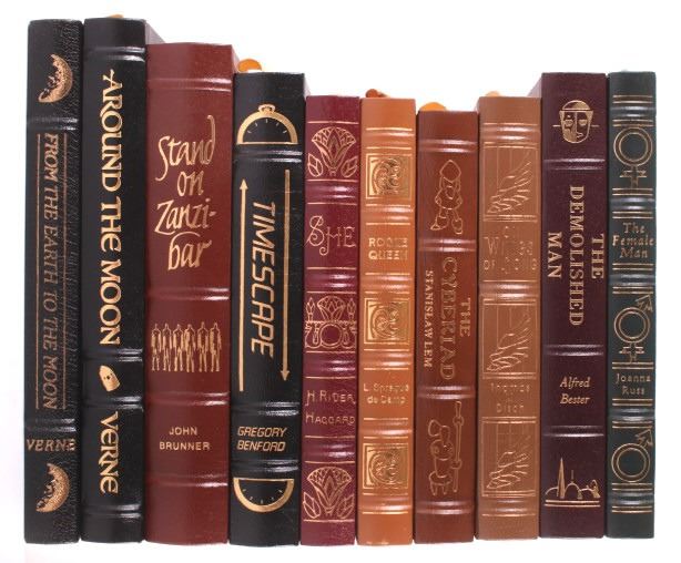 Provided for auction in this lot is a collection of ten Easton Press leather bound, gilted novels, each is a part of "The Masterpieces of Science Fiction" series. The collection is comprised of From the Earth to the Moon by Jules Verne, Around the Moon by Jules Verne, Stand on Zanzibar by John Brunner, Timescape by Gregory Benford, The Demolished Man by Alfred Bester, The Female Man by Joanna Russ, On Wings of Song by Thomas M. Disch, Rogue Queen by L. Sprague de Camp, The Cyberia by Stanislaw Lem, and She by H. Rider Haggard. The collection shows very good condition, with bright gold text blocks, silk book marks, and very nice covers. Each novel comes with Easton Press collectors notes. The largest book is 10 3/8" tall, 7 1/2" wide, and 1 1/4" thick.