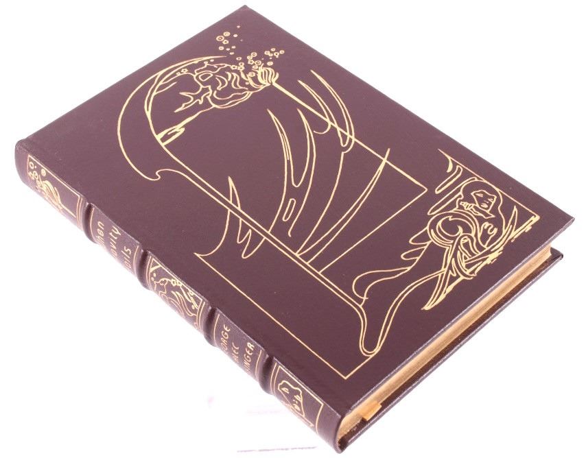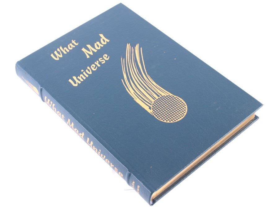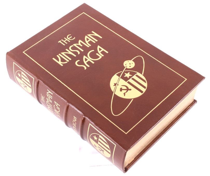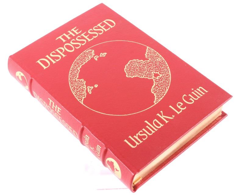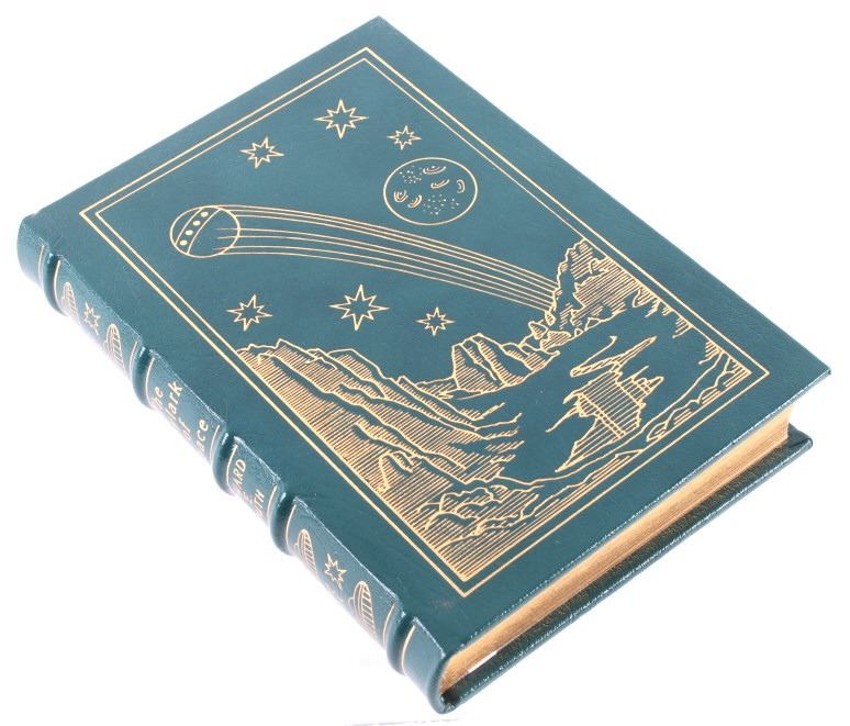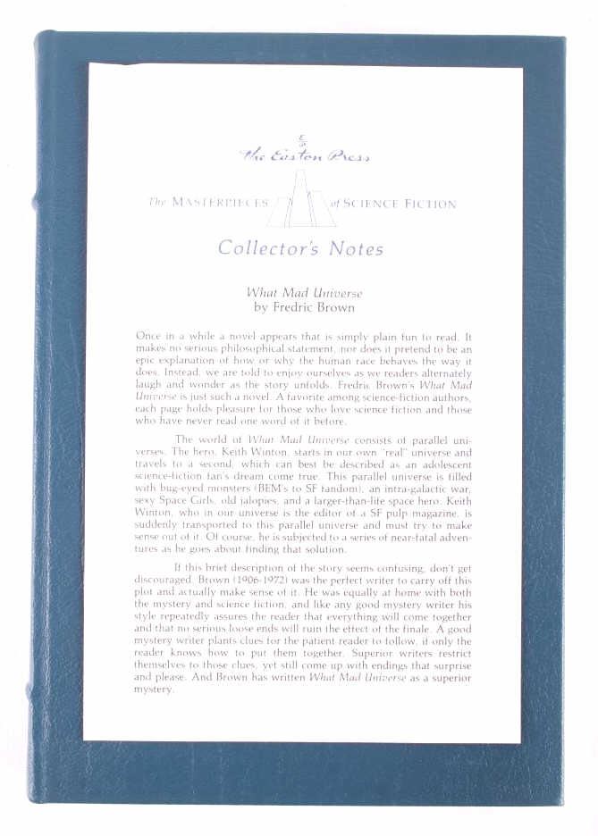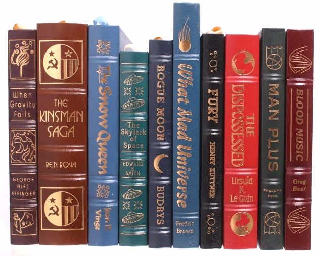 Provided for bidding in this lot is a collection of ten Easton Press, leather bound and gilted science fiction books, which are a part of "The Easton Press - The Masterpieces of Science Fiction" series. This collection consists of When Gravity Fails by George Alec Effinger, The Kinsman Saga by Ben Bova, The Snow Queen by Joan Vinge, The Skylark of Space by E. E. Smith, Rogue Moon by Algis Budrys, What Mad Universe by Frederic Brown, Fury by Henry Kuttner, The Dispossessed by Ursula K. Le Guin, Man Plus by Frederik Pohl, and Blood Music by Greg Bear. Each book is adorned with a gold text block, and silk bookmarks. Additionally, the books are each accompanied by Easton Press Collectors Notes. The largest book is 8 3/4" tall, 6 1/4" wide, and 2" thick.