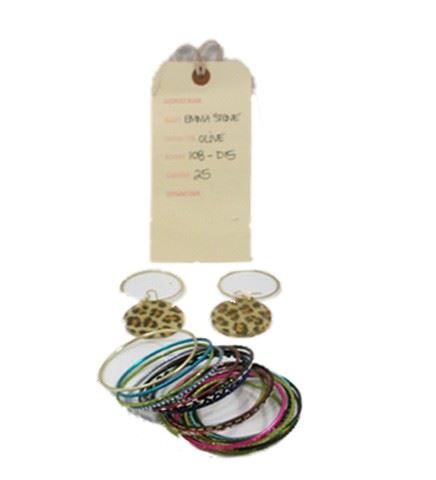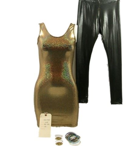 As seen in the new high school comedy, Easy A, this is Olive (Emma Stone) screen worn, hero, shiny gold stretchy 'American Apparel' tank dress top, (size S) black spandex metallic with rectangle print 'American Apparel' pant leggings, (size S) multiple shiny and colored bracelets, and plastic leopard print dangling earrings. Includes wardrobe tag!