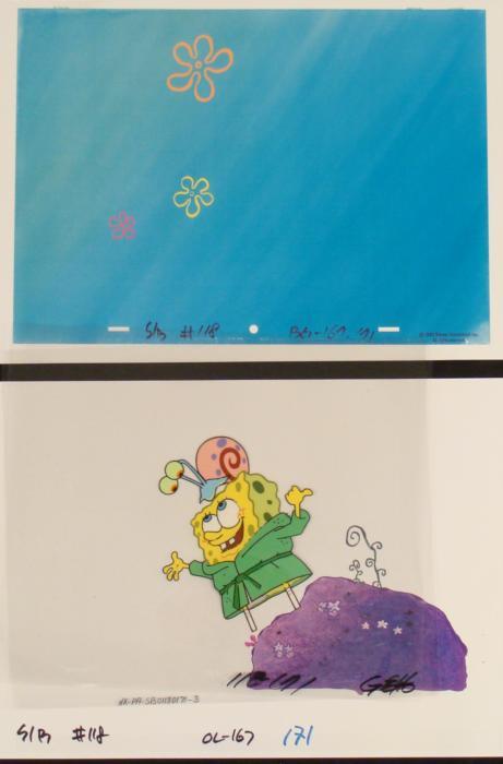 Offered here are two reproduction backgrounds (over and underlay) and an original animation cel from the Nickelodeon TV show SpongeBob Squarepants. The story takes place under the deep blue sea in Bikini Bottom, where SpongeBob resides. SpongeBob, who is a yellow, porous sponge, is your typical happy-go-lucky character, as he is always cheerful and enjoys making people laugh. Patrick Star, SpongeBob's neighbor who is a starfish, is your average children's show idiot, as he boasts knowing nothing and is often getting himself into ridiculous situations. Between the homes of these two lies the home of the miserable Squidward, a squid, who is known for being grouchy and playing tricks on SpongeBob and Patrick. Both SpongeBob and Squidward work at the Krusty Krab, a fast food business run by the greedy money-loving Mr. Krabs, a crab, the arch rival of the evil, possibly misunderstood, Plankton. Another neighbor, Sandy Cheeks, an athletic squirrel who normally wears an astronaut's space suit, was introduced in "Tea at the Treedome." She spends most of her time inventing and experimenting. Look how easy this is...Original Production Background and Animated Cel Overall Size of Backgrounds: 11" x 17" Overall Size of the Cels: 10 1/2" x 14" Excellent ConditionThis is an original hand-painted cel set-up used in the production of an episode of "SpongeBob SquarePants." Each one-of-a-kind set-up represents a slight change in position of the characters. When individually photographed and projected in rapid succession, the images appear to move.