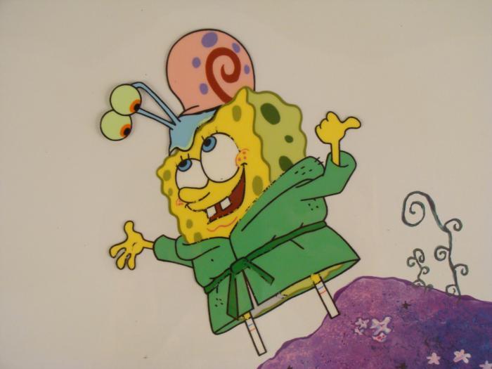 To create production cels, the original animator's drawing is transferred onto an acetate cel (by hand-inking and/or photo copying). The cel is then hand-painted on the reverse side. The background accompanying this set-up is a reproduction background. The background is ready to be matted and framed. It is a colored background with a cel and has the animator's notations at the bottom both. The cel has multi-layers; first is Gary's eyes and part of his body and next is Spongebob and Gary's shell.