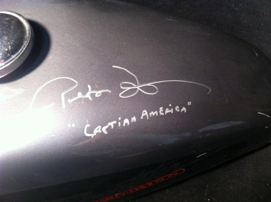 Easy Rider (1969) - A Peter Fonda autographed Harley Davidson gas tank, signed "Captain America" and an ordinal foreign folded one sheet signed the same way. Tank: 18" x 11" x 8". Poster: 20" x 28". Oversized item. Additional shipping charges required.