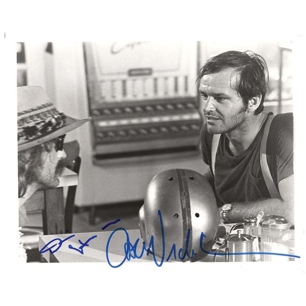 Glossy 10 x 8 photo of Dennis Hopper as Billy and Jack Nicholson as George Hanson in the 1969 film Easy Rider, signed by both in blue felt tip. In fine condition.