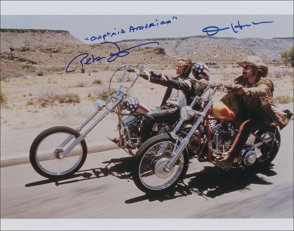 Color glossy 14 x 11 photo from the film, signed in blue felt tip by Dennis Hopper and Peter Fonda, who adds “Captain America.” In very fine condition.