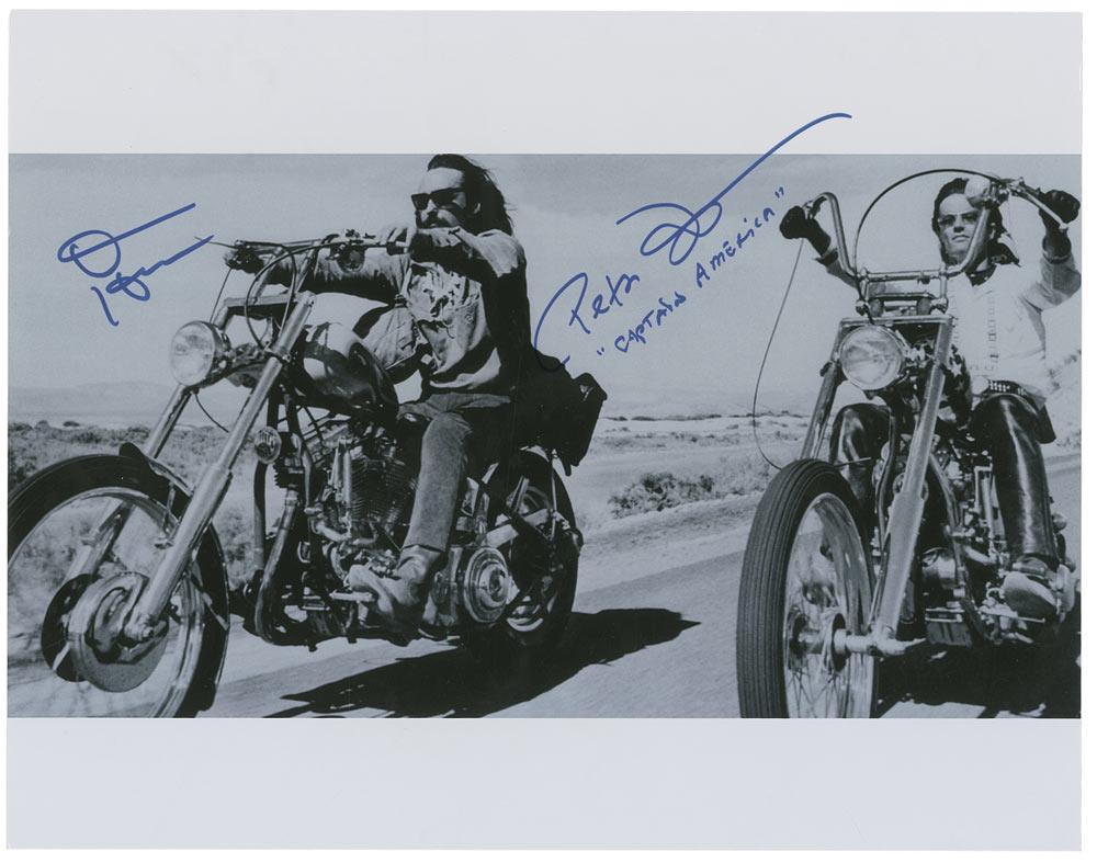 Glossy metallic-like 14 x 11 photo from the film, signed in blue felt tip by Dennis Hopper and Peter Fonda, who adds “Captain America.” In fine condition.