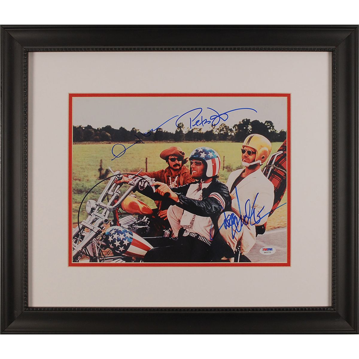 Color glossy 13 x 10 photo, signed in blue felt tip by Dennis Hopper, Peter Fonda, and Jack Nicholson. Nicely double-matted and framed to an overall size of 22 x 18.75. In fine condition, with a PSA/DNA label affixed to the lower right corner. Accompanied